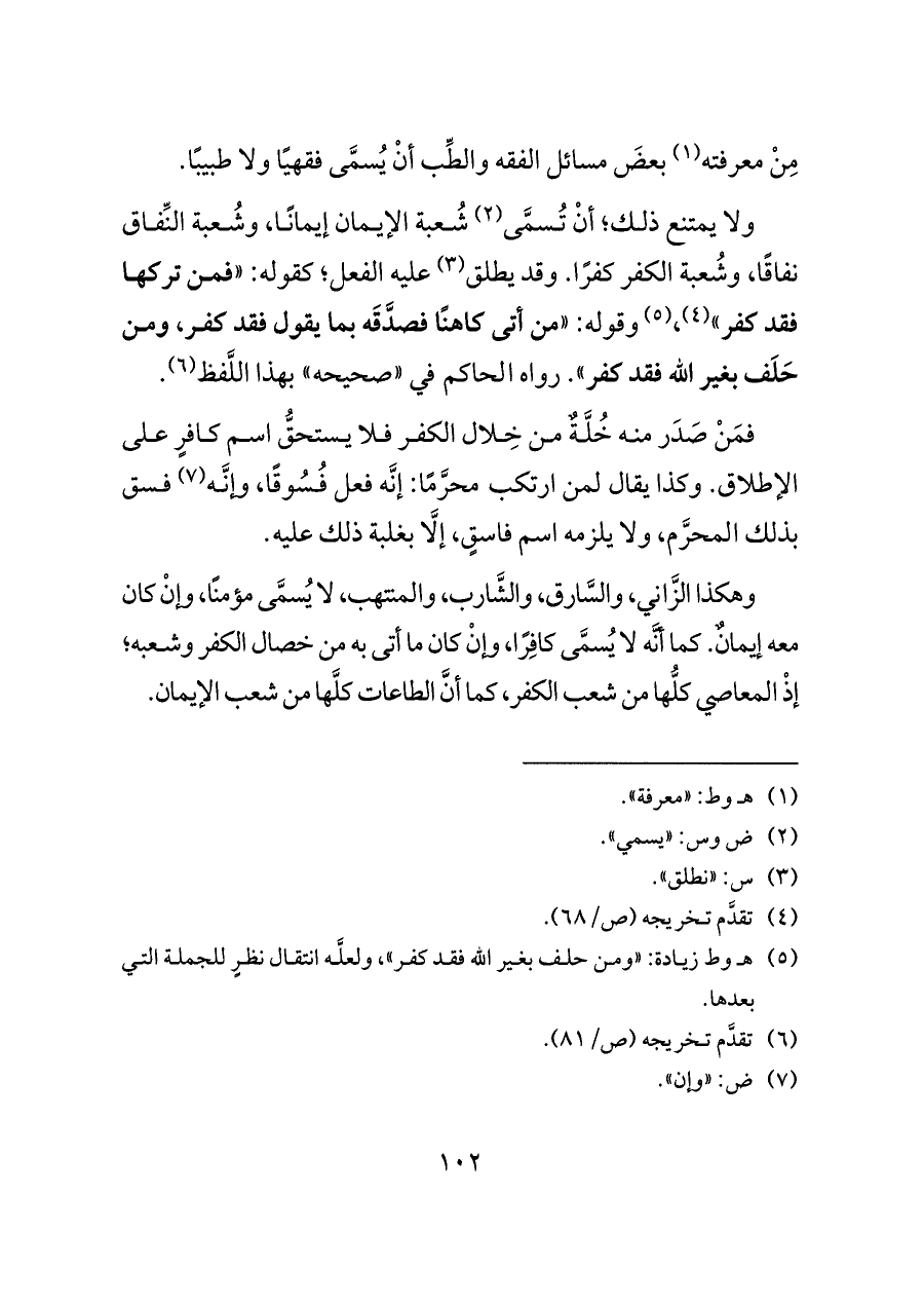 ولا يمتنع ذلك؛ أنْ تُسمَّى (¬٢) شُعبة الإيمان إيمانًا، وشُعبة النِّفاق نفاقًا، وشُعبة الكفر كفرًا. وقد يطلق (¬٣) عليه الفعل؛ كقوله: "فمن تركها فقد كفر" (¬٤)، (¬٥) وقوله: "من أتى كاهنًا فصدَّقَه بما يقول فقد كفر، ومن حَلَف بغير الله فقد كفر". رواه الحاكم في "صحيحه" بهذا اللَّفظ (¬٦).