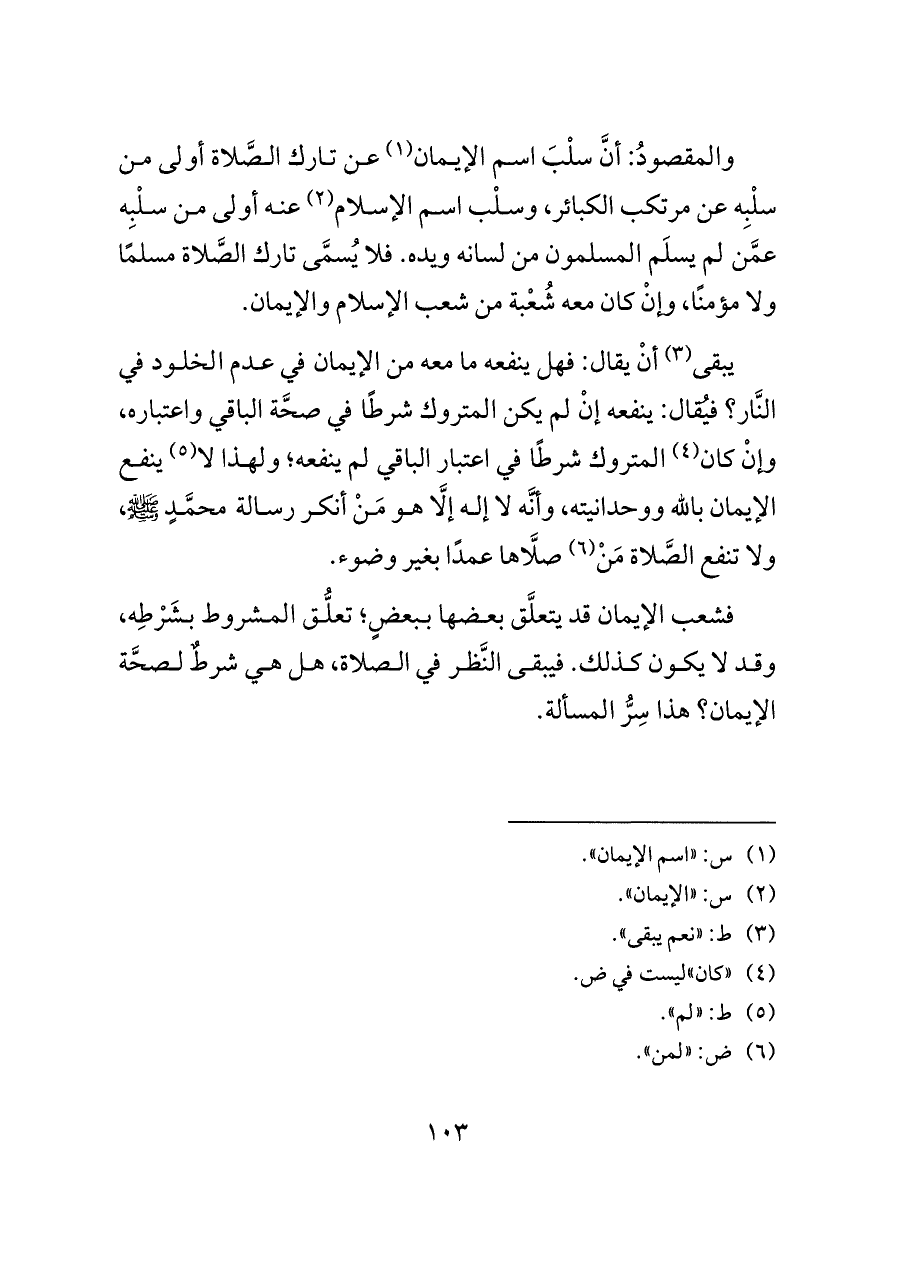 فشعب الإيمان قد يتعلَّق بعضها ببعضٍ؛ تعلُّق المشروط بشَرْطِه، وقد لا يكون كذلك. فيبقى النَّظر في الصلاة، هل هي شرطٌ لصحَّة الإيمان؟ هذا سِرُّ المسألة.