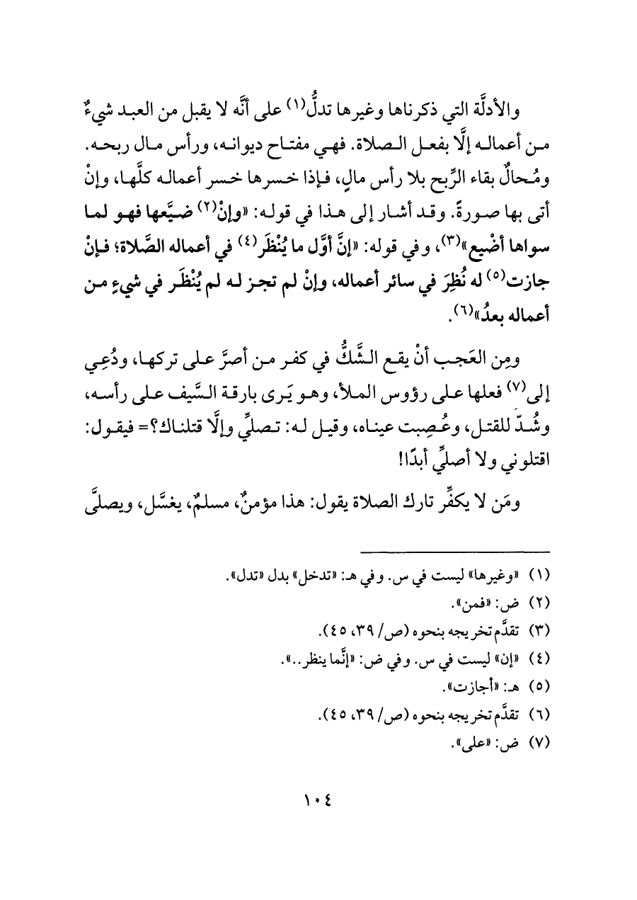 ومِن العَجب أنْ يقع الشَّكُّ في كفر من أصرَّ على تركها، ودُعِي إلى (¬٧) فعلها على رؤوس الملأ، وهو يَرى بارقة السَّيف على رأسه، وشُدَّ للقتل، وعُصِبت عيناه، وقيل له: تصلِّي وإلَّا قتلناك؟ = فيقول: اقتلوني ولا أصلِّي أبدًا!
