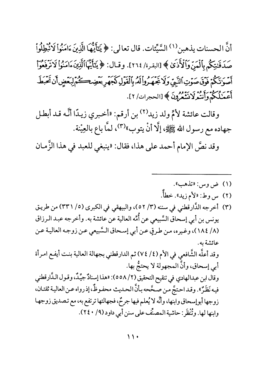 وقالت عائشة لأمِّ ولد زيد (¬٢) بن أرقم: "أخبري زيدًا أنَّه قد أبطل جهاده مع رسول الله - صلى الله عليه وسلم -، إلَّا أنْ يتوب" (¬٣)، لمَّا باع بالعِيْنة.