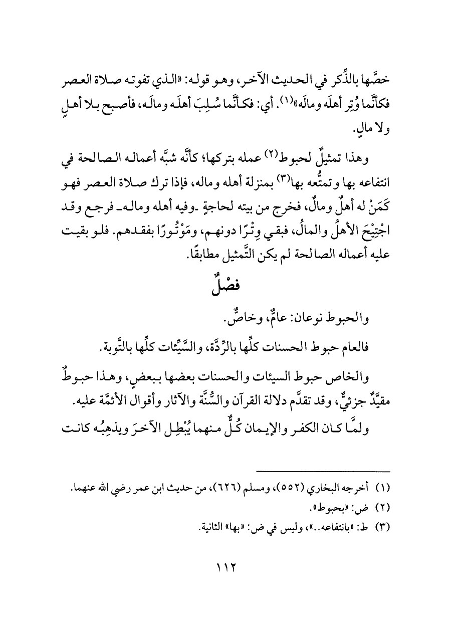والخاص حبوط السيئات والحسنات بعضها ببعضٍ، وهذا حبوطٌ مقيَّدٌ جزئيٌّ، وقد تقدَّم دلالة القرآن والسُّنَّة والآثار وأقوال الأئمَّة عليه.