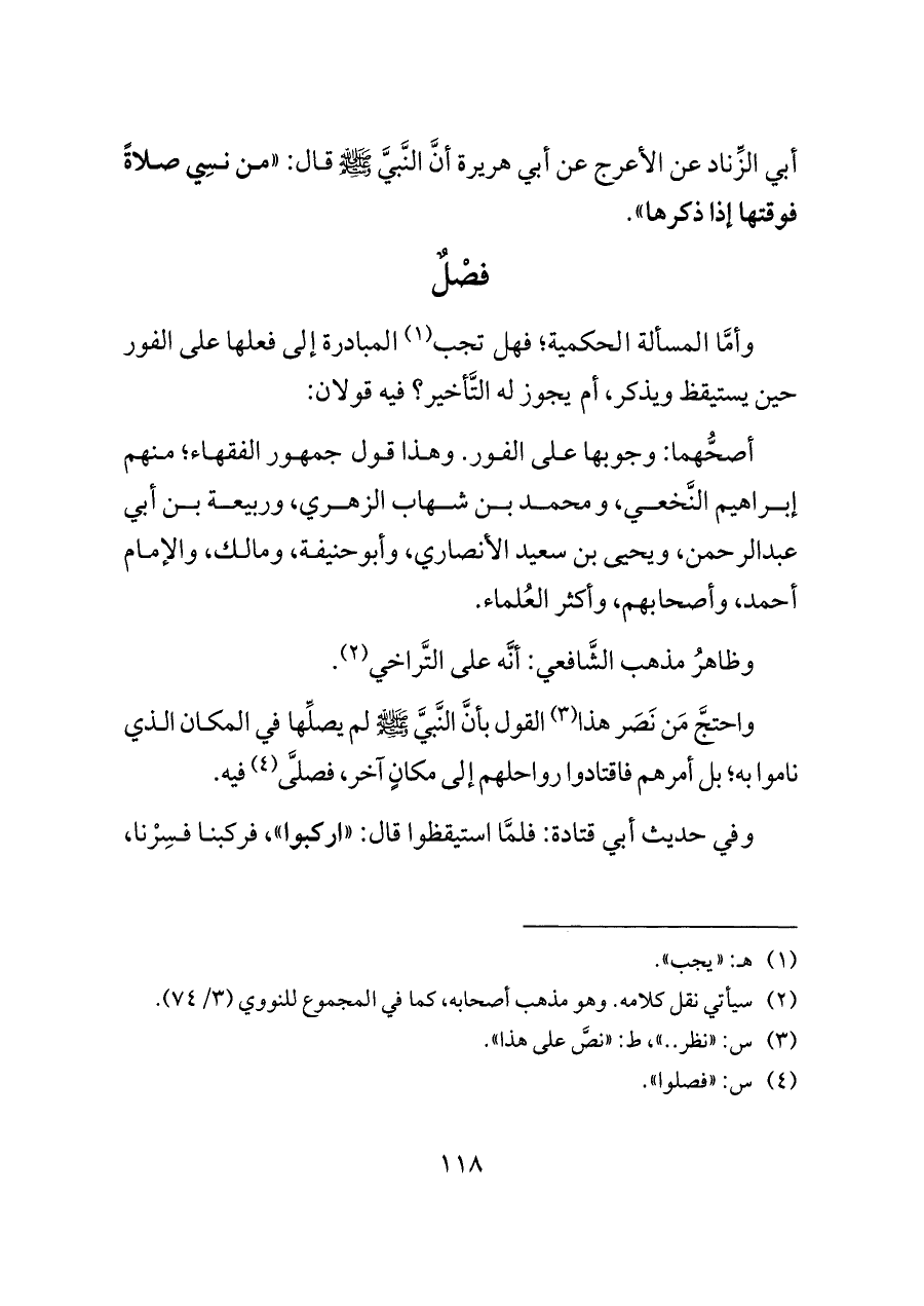 واحتجَّ مَن نَصَر هذا (¬٣) القول بأنَّ النَّبيَّ - صلى الله عليه وسلم - لم يصلِّها في المكان الذي ناموا به؛ بل أمرهم فاقتادوا رواحلهم إلى مكانٍ آخر، فصلَّى (¬٤) فيه.