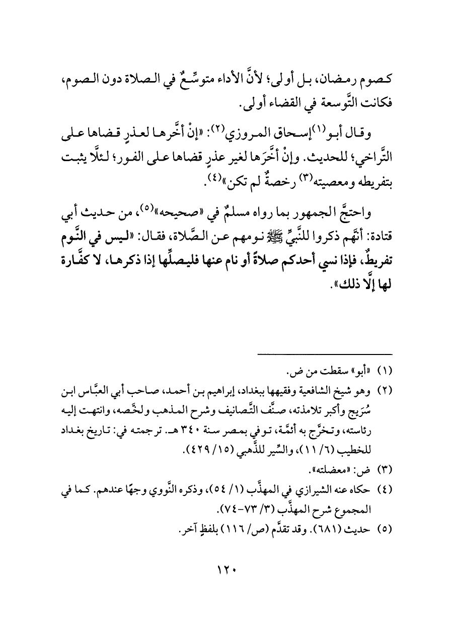 وقال أبو (¬١) إسحاق المروزي (¬٢): "إنْ أخَّرها لعذرٍ قضاها على التَّراخي؛ للحديث. وإنْ أخَّرَها لغير عذرٍ قضاها على الفور؛ لئلَّا يثبت بتفريطه ومعصيته (¬٣) رخصةٌ لم تكن" (¬٤).