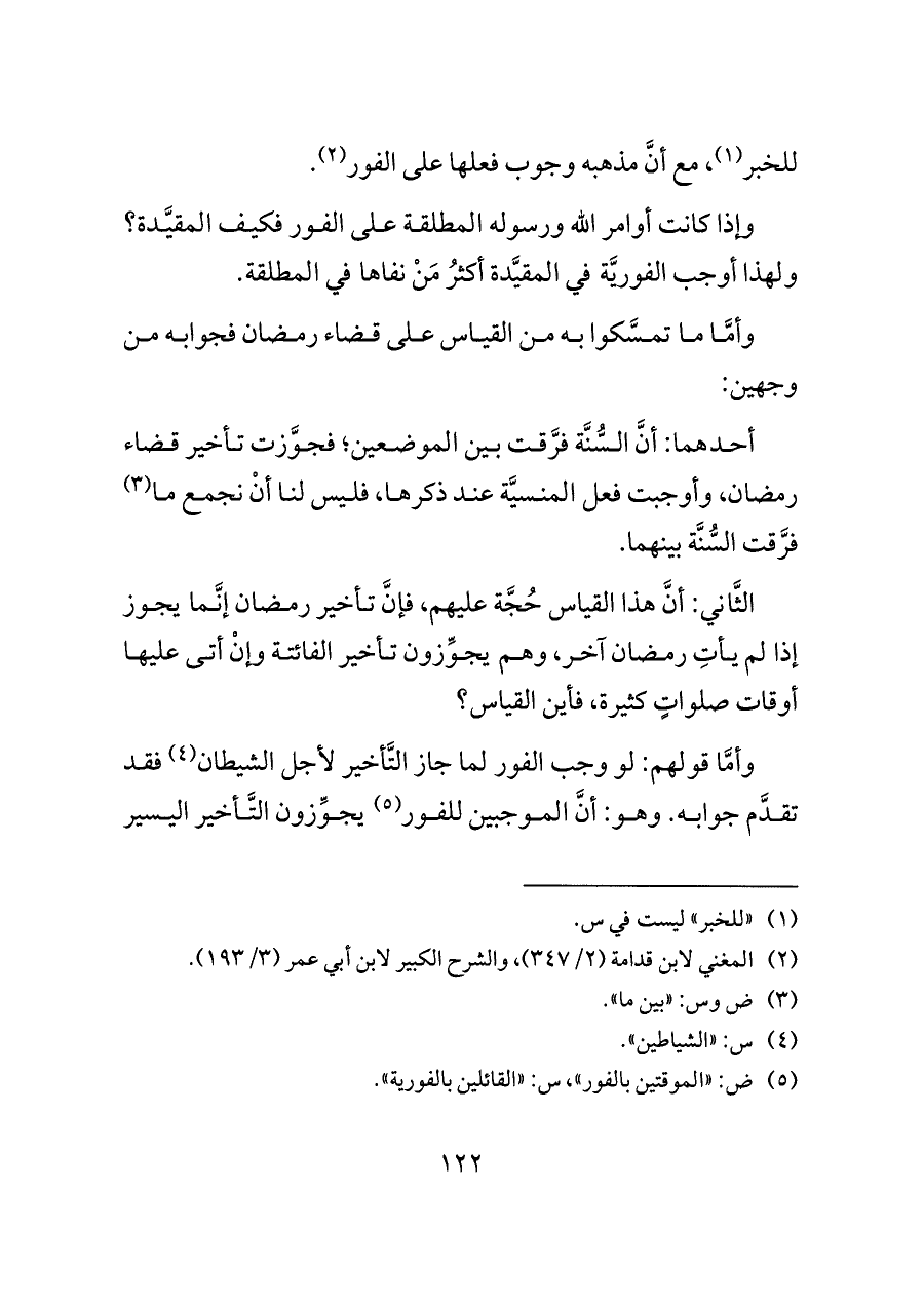 وأمَّا قولهم: لو وجب الفور لما جاز التَّأخير لأجل الشيطان (¬٤) فقد تقدَّم جوابه. وهو: أنَّ الموجبين للفور (¬٥) يجوِّزون التَّأخير اليسير
