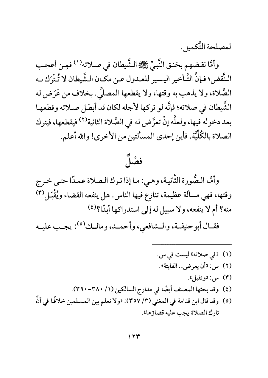 وأمَّا نقضهم بخنق النَّبيِّ - صلى الله عليه وسلم - الشَّيطان في صلاته (¬١) فمِن أعجب النَّقض؛ فإنَّ التَّأخير اليسير للعدول عن مكان الشَّيطان لا تُتْرَك به الصَّلاة، ولا يذهب به وقتها، ولا يقطعها المصلِّي. بخلاف من عَرَض له الشَّيطان في صلاته؛ فإنَّه لو تركها لأجله لكان قد أبطل صلاته وقطعها بعد دخوله فيها، ولعلَّه إنْ تعرَّض له في الصَّلاة الثانية (¬٢) فيقطعها، فيترك الصلاة بالكُلِّيَّة. فأين إحدى المسألتين من الأخرى! والله أعلم.