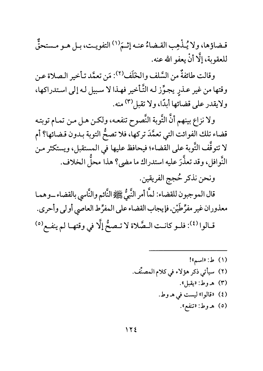 ولا نزاع بينهم أنَّ التَّوبة النَّصوح تنفعه، ولكن هل من تمام توبته قضاء تلك الفوائت التي تعمَّدَ تركها، فلا تصحُّ التوبة بدون قضائها؟ أم لا تتوقَّف التَّوبة على القضاء؛ فيحافظ عليها في المستقبل، ويستكثر من النَّوافل، وقد تعذَّرَ عليه استدراك ما مضى؟ هذا محلُّ الخلاف.