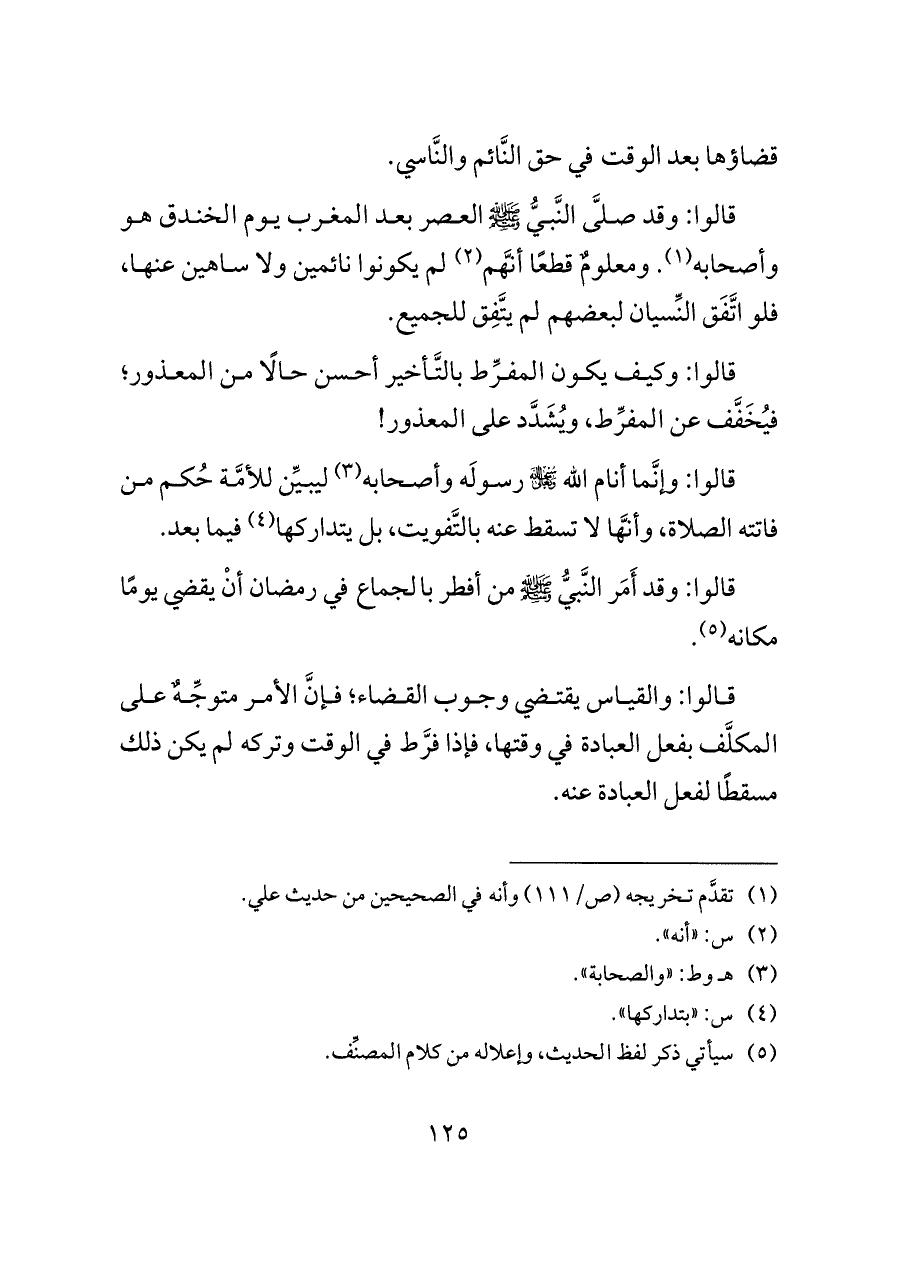 قالوا: وقد صلَّى النَّبيُّ - صلى الله عليه وسلم - العصر بعد المغرب يوم الخندق هو وأصحابه (¬١). ومعلومٌ قطعًا أنَّهم (¬٢) لم يكونوا نائمين ولا ساهين عنها، فلو اتَّفَق النِّسيان لبعضهم لم يتَّفِق للجميع.
