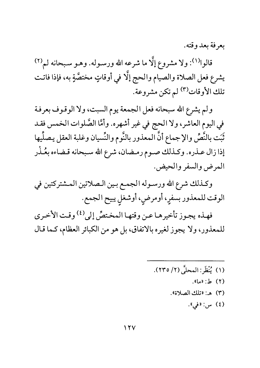 ولم يشرع الله سبحانه فعل الجمعة يوم السبت، ولا الوقوف بعرفة في اليوم العاشر، ولا الحج في غير أشهره. وأمَّا الصَّلوات الخمس فقد ثَبَت بالنَّصِّ والإجماع أنَّ المعذور بالنَّوم والنِّسيان وغلبة العقل يصلِّيها إذا زال عذره. وكذلك صوم رمضان، شرع الله سبحانه قضاءه بعُذْر المرض والسفر والحيض.