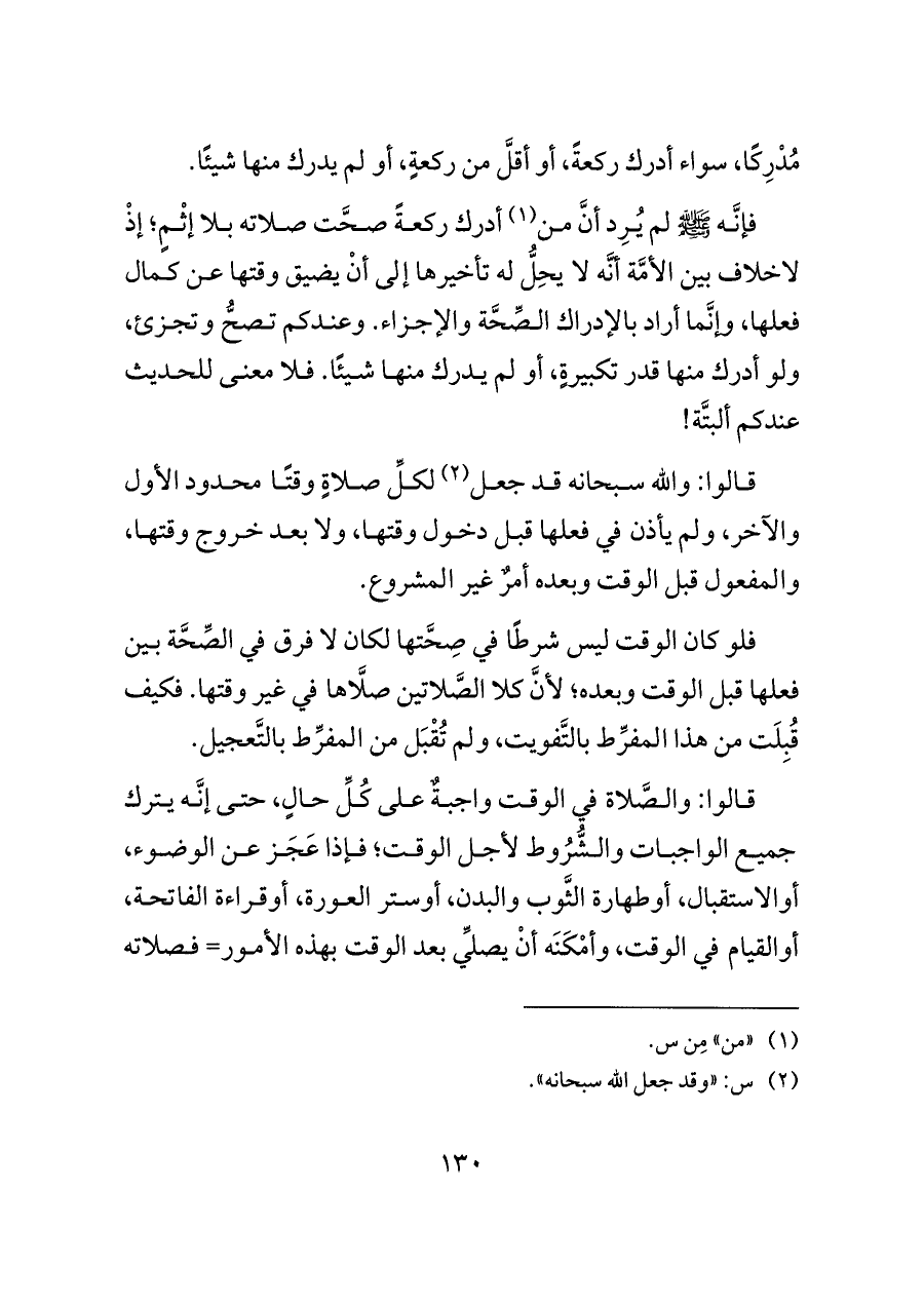فإنَّه - صلى الله عليه وسلم - لم يُرِد أنَّ من (¬١) أدرك ركعةً صحَّت صلاته بلا إثْمٍ؛ إذْ لاخلاف بين الأمَّة أنَّه لا يحِلُّ له تأخيرها إلى أنْ يضيق وقتها عن كمال فعلها، وإنَّما أراد بالإدراك الصِّحَّة والإجزاء. وعندكم تصحُّ وتجزئ، ولو أدرك منها قدر تكبيرةٍ، أو لم يدرك منها شيئًا. فلا معنى للحديث عندكم ألبتَّة!