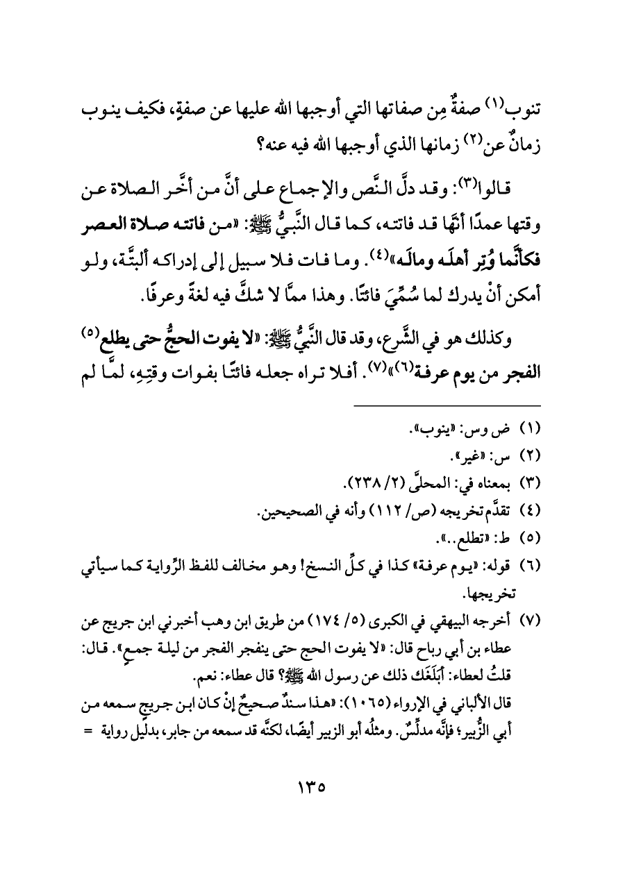 (¬٧) أخرجه البيهقي في الكبرى (٥/ ١٧٤) من طريق ابن وهب أخبرني ابن جريج عن عطاء بن أبي رباح قال: "لا يفوت الحج حتى ينفجر الفجر من ليلة جمعٍ". قال: قلتُ لعطاء: أبَلَغَك ذلك عن رسول الله - صلى الله عليه وسلم -؟ قال عطاء: نعم.