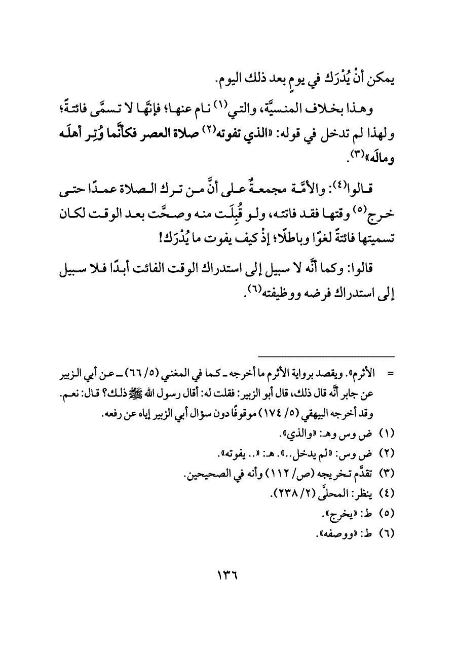 وهذا بخلاف المنسيَّة، والتي (¬١) نام عنها؛ فإنَّها لا تسمَّى فائتةً؛ ولهذا لم تدخل في قوله: "الذي تفوته (¬٢) صلاة العصر فكأنَّما وُتِر أهلَه ومالَه" (¬٣).