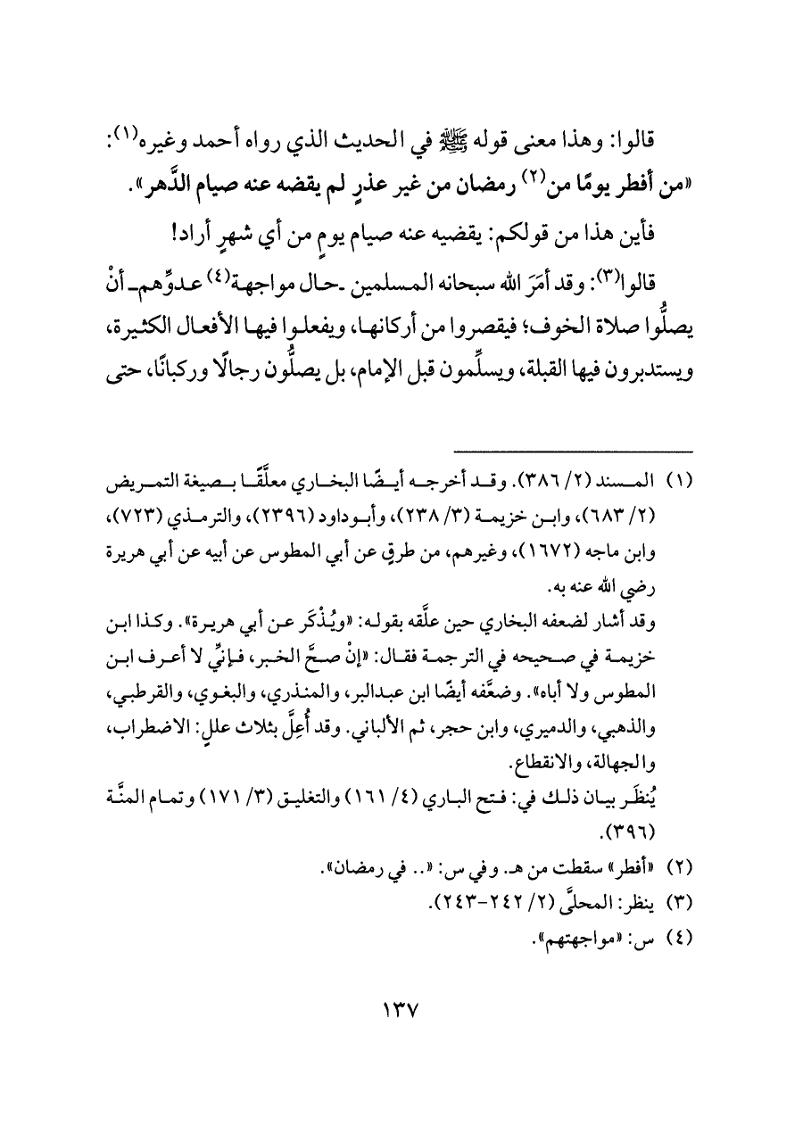 قالوا: وهذا معنى قوله - صلى الله عليه وسلم - في الحديث الذي رواه أحمد وغيره (¬١): "من أفطر يومًا من (¬٢) رمضان من غير عذرٍ لم يقضه عنه صيام الدَّهر".