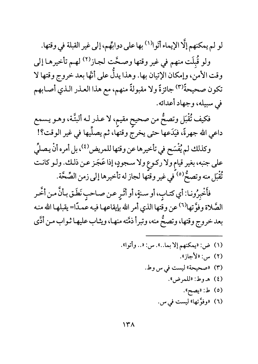 ولو قُبِلَت منهم في غير وقتها وصحَّت لجاز (¬٢) لهم تأخيرها إلى وقت الأمن، وإمكان الإتيان بها. وهذا يدلُّ على أنَّها بعد خروج وقتها لا تكون صحيحةً (¬٣) جائزةً ولا مقبولةً منهم، مع هذا العذر الذي أصابهم في سبيله، وجهاد أعدائه.