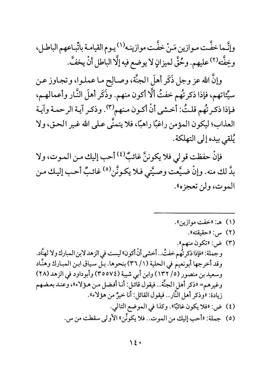 وجملة: "فإذا ذكرتُهم خفتُ .. أخشى أنْ أكون" ليست في الزهد لابن المبارك ولا لهنَّاد.