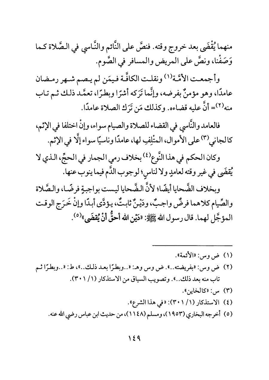 (¬٢) ض وس: "بفريضته .. ". ض وس وهـ: " .. وبطرًا بعد ذلك .. "، ط: " .. وبطرًا ثم تاب منه بعد ذلك .. ". وتصويب السياق من الاستذكار (١/ ٣٠١).