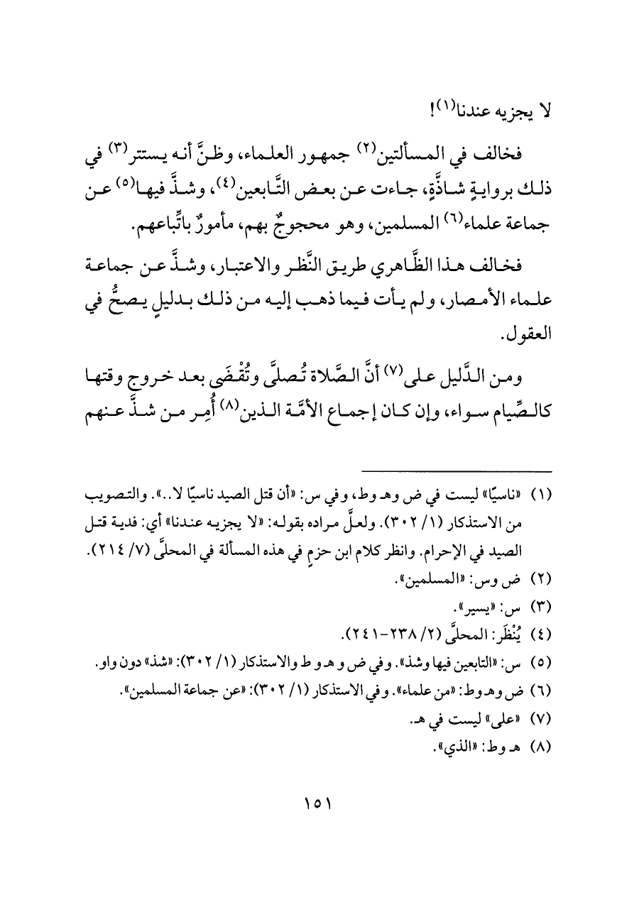(¬١) "ناسيًا" ليست في ض وهـ وط، وفي س: "أن قتل الصيد ناسيًا لا .. ". والتصويب من الاستذكار (١/ ٣٠٢). ولعلَّ مراده بقوله: "لا يجزيه عندنا" أي: فدية قتل الصيد في الإحرام. وانظر كلام ابن حزمٍ في هذه المسألة في المحلَّى (٧/ ٢١٤).