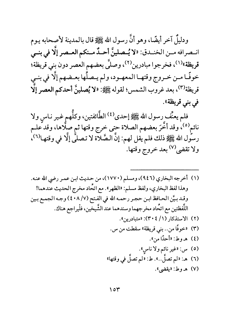 ودليلٌ آخر أيضًا، وهو أنَّ رسول الله - صلى الله عليه وسلم - قال بالمدينة لأصحابه يوم انصرافه من الخندق: "لا يُصلينَّ أحدٌ منكم العصر إلَّا في بني قريظة" (¬١)، فخرجوا مبادرين (¬٢)، وصلَّى بعضهم العصر دون بني قريظة؛ خوفًا من خروج وقتها المعهود، ولم يصلِّها بعضهم إلَّا في بني قريظة (¬٣)، بعد غروب الشمس؛ لقوله - صلى الله عليه وسلم -: "لا يُصلينَّ أحدكم العصر إلَّا في بني قريظة".