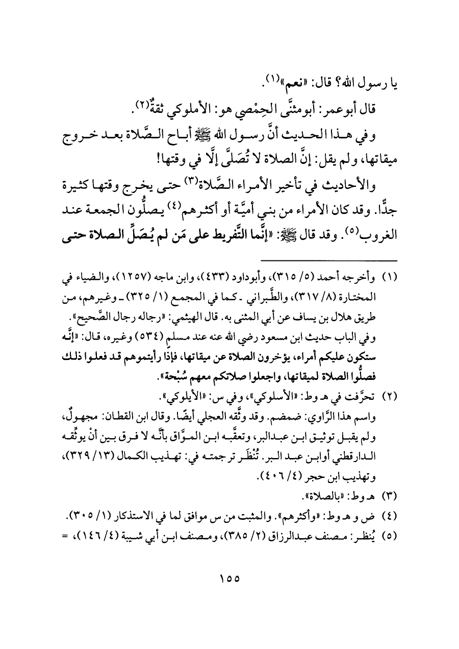 والأحاديث في تأخير الأمراء الصَّلاة (¬٣) حتى يخرج وقتها كثيرة جدًّا. وقد كان الأمراء من بني أميَّة أو أكثرهم (¬٤) يصلُّون الجمعة عند الغروب (¬٥).