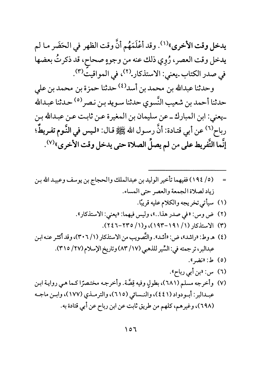 ــ يعني: ابن المبارك ــ عن سليمان بن المغيرة عن ثابت عن عبدالله بن رباح (¬٦) عن أبي قتادة: أنَّ رسول الله - صلى الله عليه وسلم - قال: "ليس في النَّوم تفريطٌ؛ إنَّما التَّفريط على من لم يصلِّ الصلاة حتى يدخل وقت الأخرى" (¬٧).