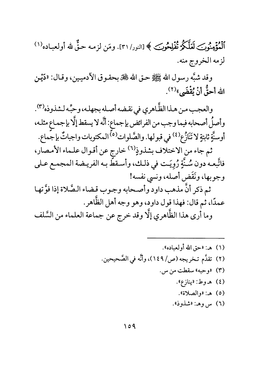 والعجب من هذا الظَّاهري في نقضه أصله بجهله، وحبِّه لشذوذه (¬٣). وأصلُ أصحابه فيما وجب من الفرائض بإجماعٍ: أنَّه لا يسقط إلَّا بإجماعٍ مثله، أوسنَّةٍ ثابتةٍ لا تَنَازُع (¬٤) في قبولها. والصَّلوات (¬٥) المكتوبات واجباتٌ بإجماع.