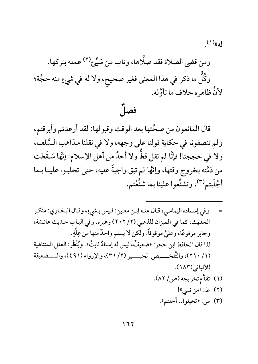 قال المانعون من صحَّتها بعد الوقت وقبولها: لقد أرعدتم وأبرقتم، ولم تنصفونا في حكاية قولنا على وجهه، ولا في نقلنا مذاهب السَّلف، ولا في حججنا! فإنَّا لم نقل قطُّ ولا أحدٌ من أهل الإسلام: إنَّها سَقَطت من ذمَّته بخروج وقتها، وإنَّها لم تبق واجبةً عليه، حتى تجلبوا علينا بما أجْلَبتم (¬٣)، وتشنِّعوا علينا بما شنَّعْتم.
