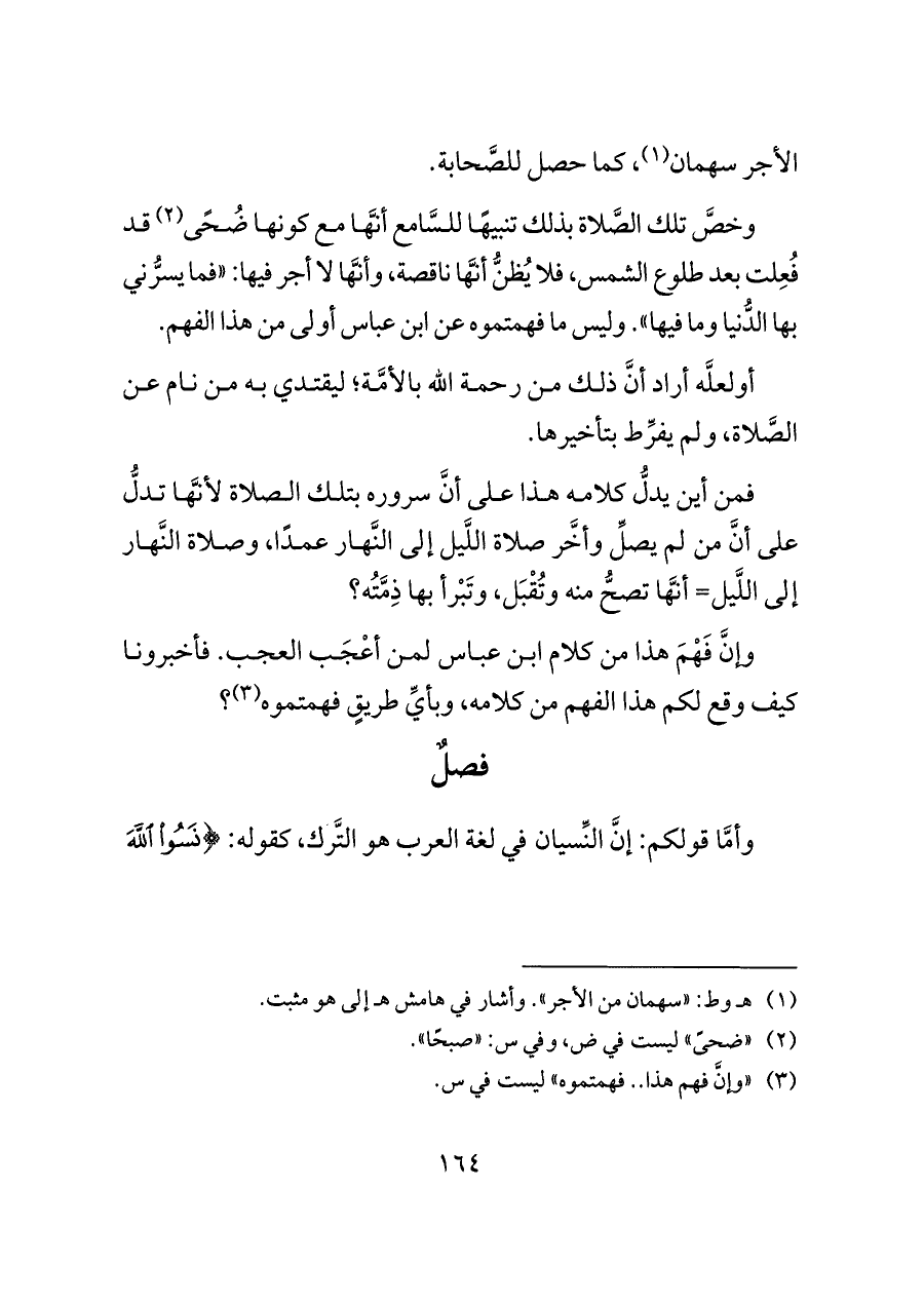 فمن أين يدلُّ كلامه هذا على أنَّ سروره بتلك الصلاة لأنَّها تدلُّ على أنَّ من لم يصلِّ وأخَّر صلاة اللَّيل إلى النَّهار عمدًا، وصلاة النَّهار إلى اللَّيل= أنَّها تصحُّ منه وتُقْبَل، وتَبْرأ بها ذِمَّتُه؟