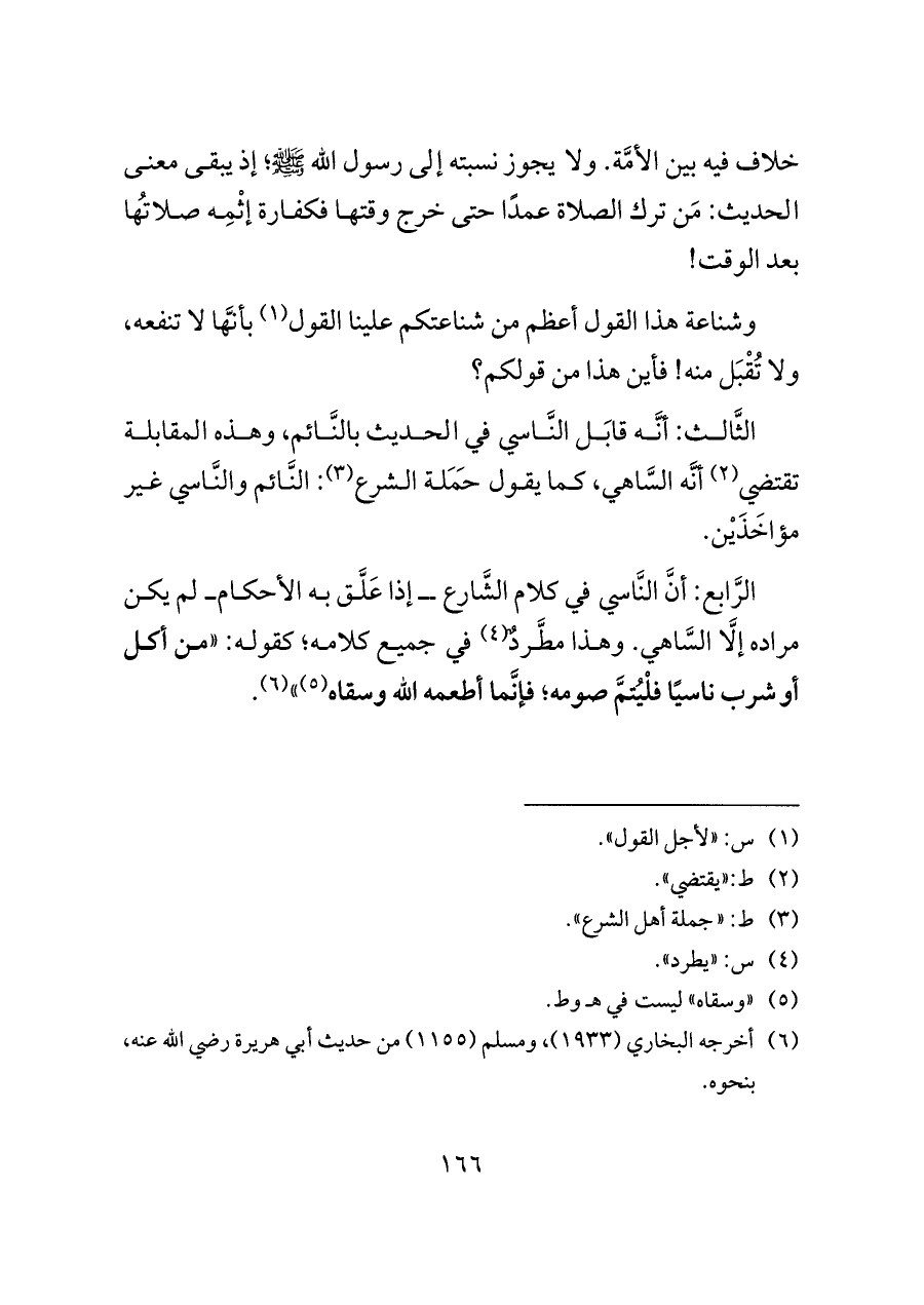 الثَّالث: أنَّه قابَل النَّاسي في الحديث بالنَّائم، وهذه المقابلة تقتضي (¬٢) أنَّه السَّاهي، كما يقول حَمَلة الشرع (¬٣): النَّائم والنَّاسي غير مؤاخَذَيْن.