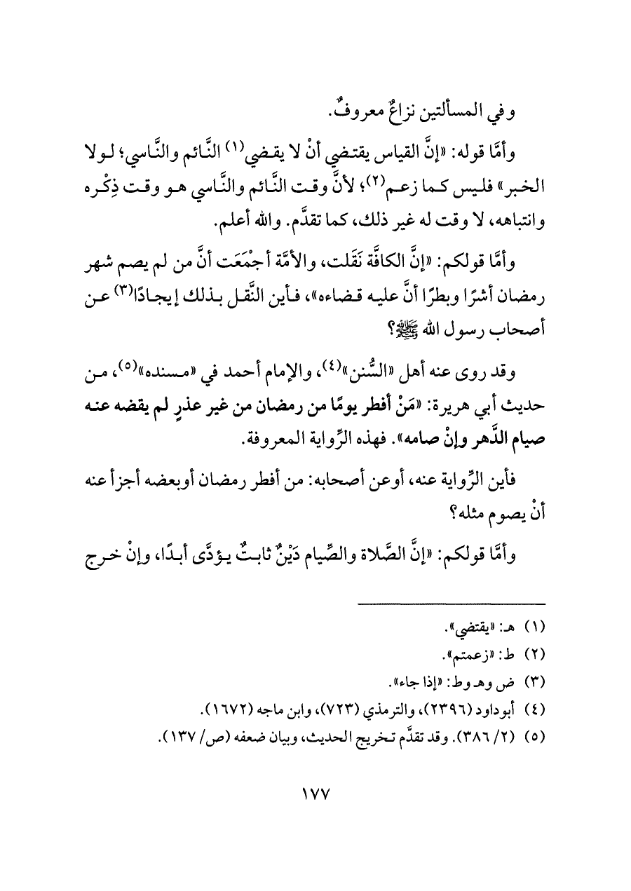 وأمَّا قولكم: "إنَّ الصَّلاة والصِّيام دَيْنٌ ثابتٌ يؤدَّى أبدًا، وإنْ خرج