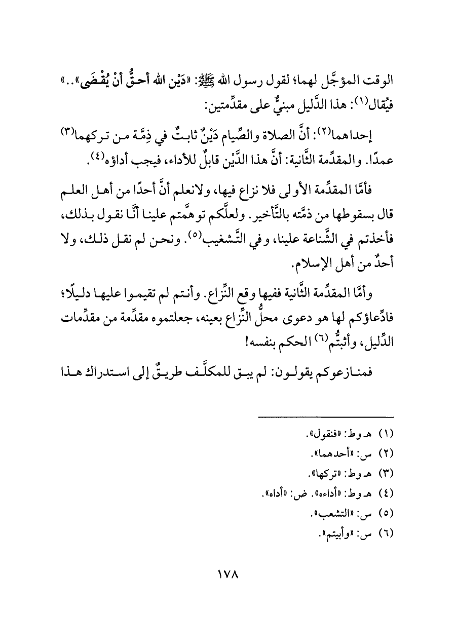 فأمَّا المقدِّمة الأولى فلا نزاع فيها، ولانعلم أنَّ أحدًا من أهل العلم قال بسقوطها من ذمَّته بالتَّأخير. ولعلَّكم توهَّمتم علينا أنَّا نقول بذلك، فأخذتم في الشَّناعة علينا، وفي التَّشغيب (¬٥). ونحن لم نقل ذلك، ولا أحدٌ من أهل الإسلام.