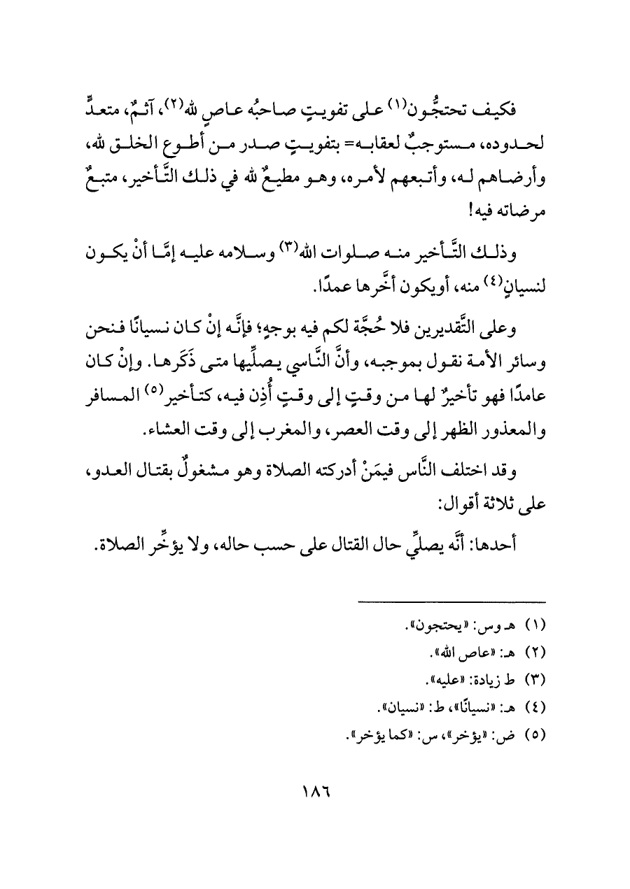 فكيف تحتجُّون (¬١) على تفويتٍ صاحبُه عاصٍ لله (¬٢)، آثمٌ، متعدٍّ لحدوده، مستوجبٌ لعقابه= بتفويتٍ صدر من أطوع الخلق لله، وأرضاهم له، وأتبعهم لأمره، وهو مطيعٌ لله في ذلك التَّأخير، متبعٌ مرضاته فيه!