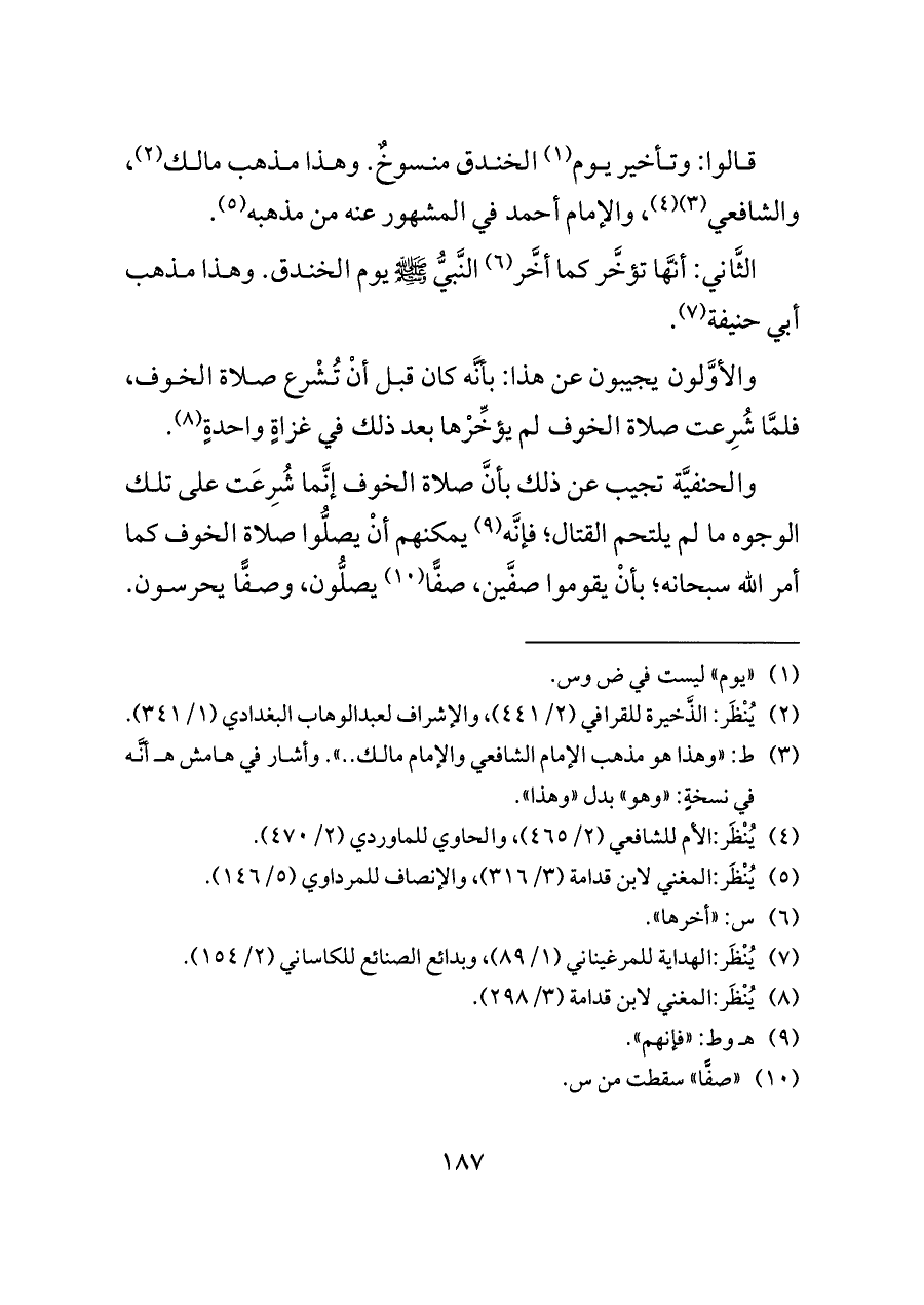 قالوا: وتأخير يوم (¬١) الخندق منسوخٌ. وهذا مذهب مالك (¬٢)، والشافعي (¬٣) (¬٤)، والإمام أحمد في المشهور عنه من مذهبه (¬٥).