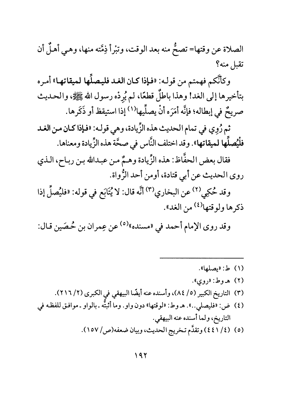 ثم رُوِي في تمام الحديث هذه الزِّيادة، وهي قوله: "فإذا كان من الغد فلْيُصلِّها لميقاتها". وقد اختلف النَّاس في صحَّة هذه الزِّيادة ومعناها.