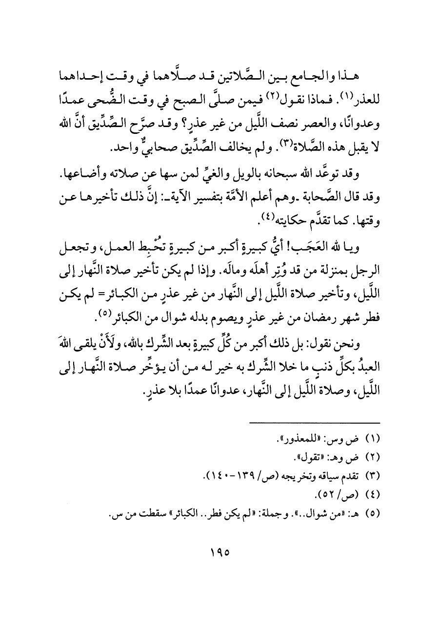 ونحن نقول: بل ذلك أكبر من كُلِّ كبيرةٍ بعد الشِّرك بالله، ولَأَنْ يلقى اللهَ العبدُ بكلِّ ذنبٍ ما خلا الشِّرك به خير له من أن يؤخِّر صلاة النَّهار إلى اللَّيل، وصلاة اللَّيل إلى النَّهار، عدوانًا عمدًا بلا عذرٍ.