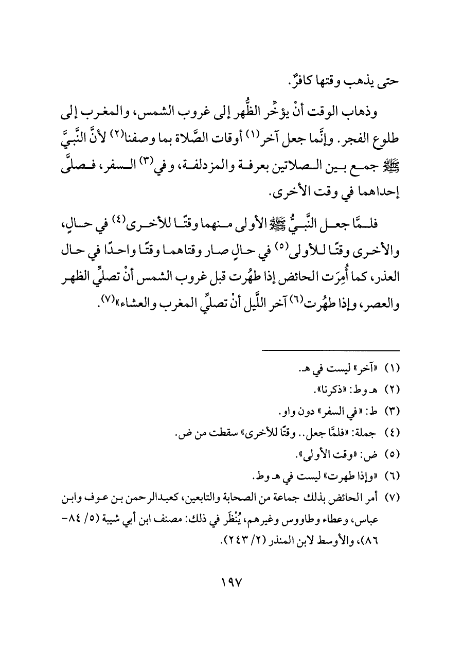 فلمَّا جعل النَّبيُّ - صلى الله عليه وسلم - الأولى منهما وقتًا للأخرى (¬٤) في حالٍ، والأخرى وقتًا للأولى (¬٥) في حالٍ صار وقتاهما وقتًا واحدًا في حال العذر، كما أُمِرَت الحائض إذا طهُرت قبل غروب الشمس أنْ تصلِّي الظهر والعصر، وإذا طهُرت (¬٦) آخر اللَّيل أنْ تصلِّي المغرب والعشاء" (¬٧).