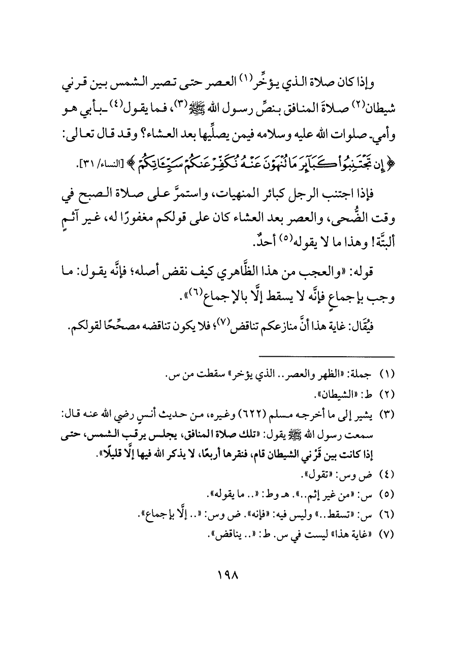 وإذا كان صلاة الذي يؤخِّر (¬١) العصر حتى تصير الشمس بين قرني شيطان (¬٢) صلاةَ المنافق بنصِّ رسول الله - صلى الله عليه وسلم - (¬٣)، فما يقول (¬٤) ـ بأبي هو وأمي ـ صلوات الله عليه وسلامه فيمن يصلِّيها بعد العشاء؟ وقد قال تعالى: {إِنْ تَجْتَنِبُوا كَبَائِرَ مَا تُنْهَوْنَ عَنْهُ نُكَفِّرْ عَنْكُمْ سَيِّئَاتِكُمْ} [النساء/٣١].