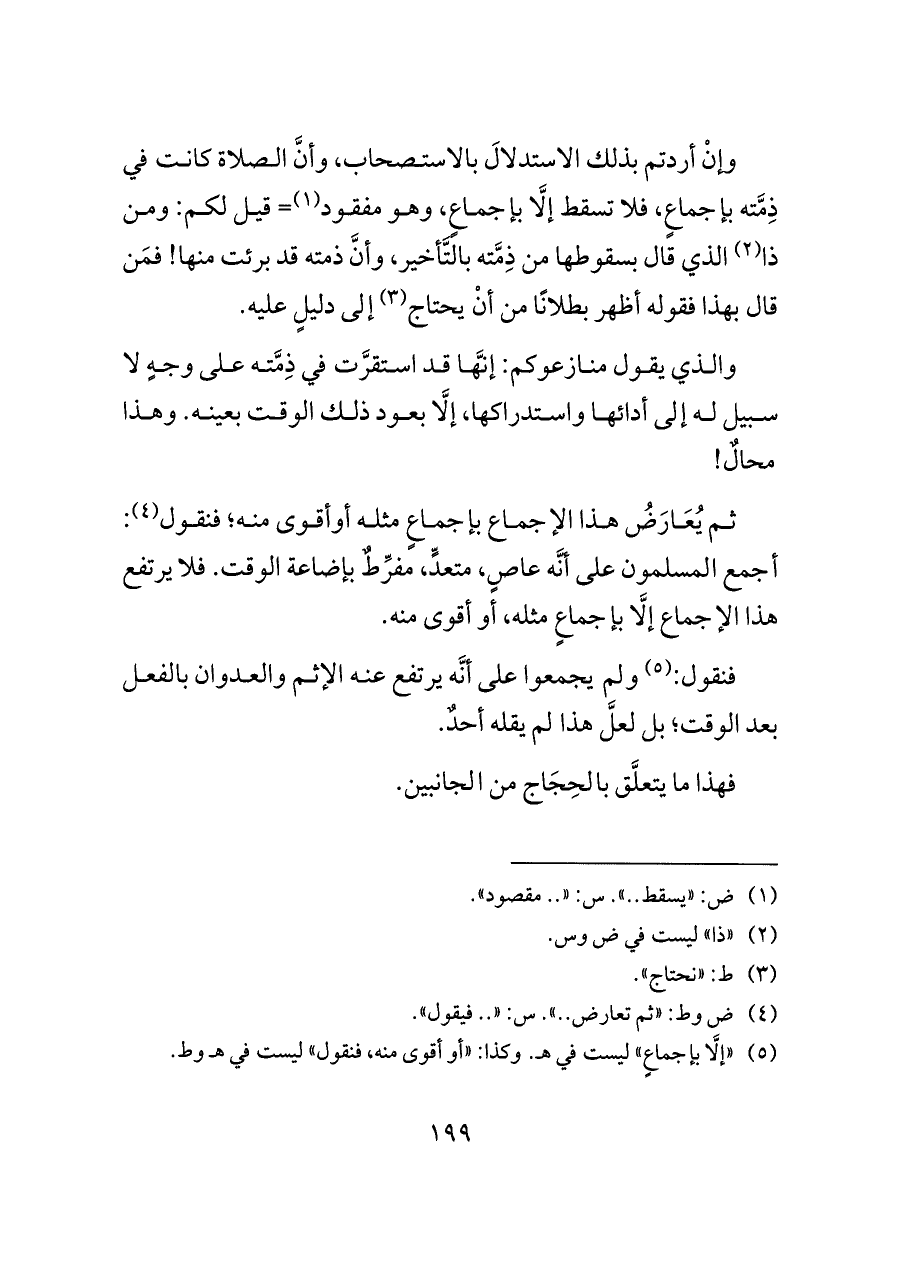 وإنْ أردتم بذلك الاستدلالَ بالاستصحاب، وأنَّ الصلاة كانت في ذِمَّته بإجماعٍ، فلا تسقط إلَّا بإجماعٍ، وهو مفقود (¬١) = قيل لكم: ومن ذا (¬٢) الذي قال بسقوطها من ذِمَّته بالتَّأخير، وأنَّ ذمته قد برئت منها! فمَن قال بهذا فقوله أظهر بطلانًا من أنْ يحتاج (¬٣) إلى دليلٍ عليه.