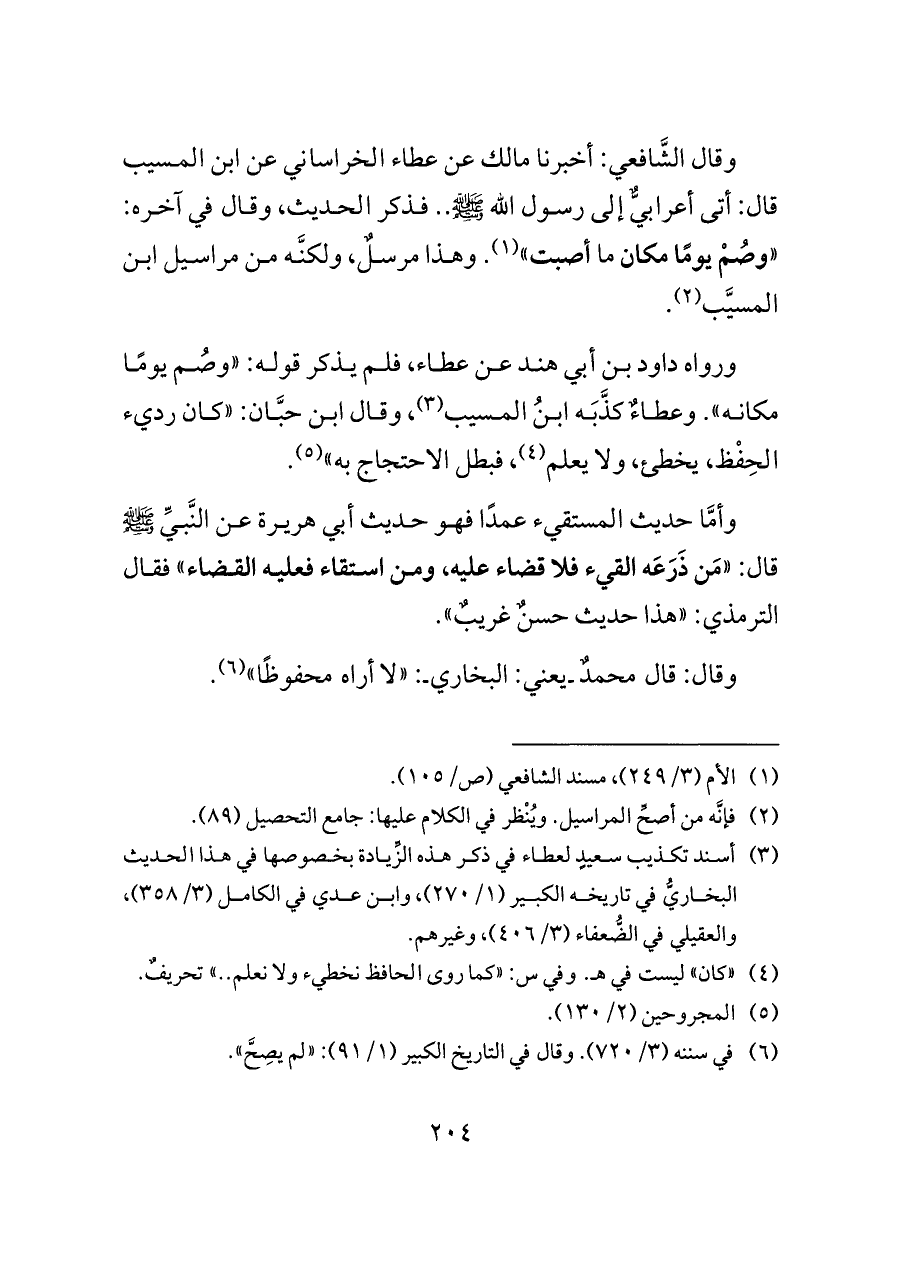 وقال الشَّافعي: أخبرنا مالك عن عطاء الخراساني عن ابن المسيب قال: أتى أعرابيٌّ إلى رسول الله - صلى الله عليه وسلم - .. فذكر الحديث، وقال في آخره: "وصُمْ يومًا مكان ما أصبت" (¬١). وهذا مرسلٌ، ولكنَّه من مراسيل ابن المسيَّب (¬٢).