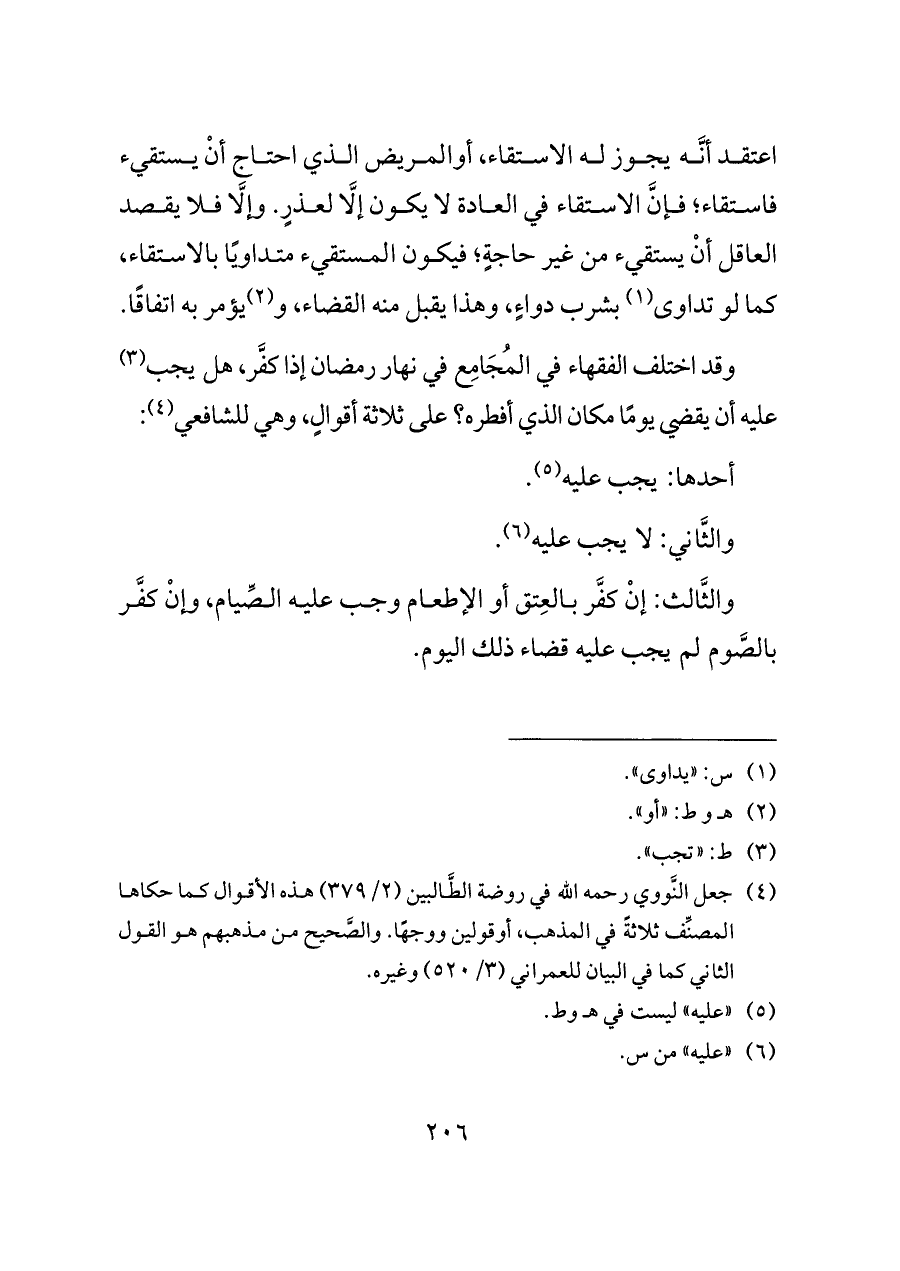 اعتقد أنَّه يجوز له الاستقاء، أوالمريض الذي احتاج أنْ يستقيء فاستقاء؛ فإنَّ الاستقاء في العادة لا يكون إلَّا لعذرٍ. وإلَّا فلا يقصد العاقل أنْ يستقيء من غير حاجةٍ؛ فيكون المستقيء متداويًا بالاستقاء، كما لو تداوى (¬١) بشرب دواءٍ، وهذا يقبل منه القضاء، و (¬٢) يؤمر به اتفاقًا.