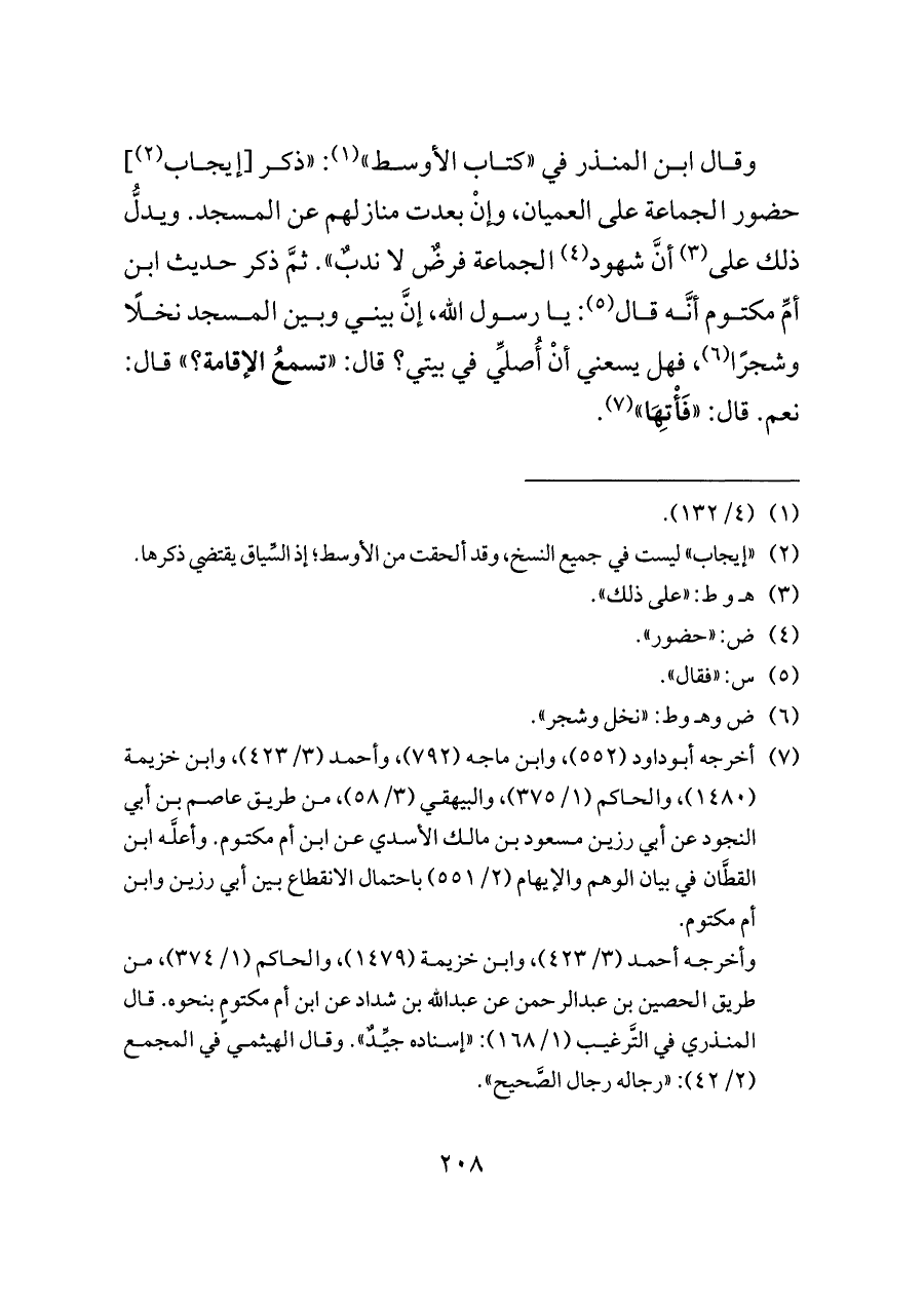 (¬٧) أخرجه أبوداود (٥٥٢)، وابن ماجه (٧٩٢)، وأحمد (٣/ ٤٢٣)، وابن خزيمة (١٤٨٠)، والحاكم (١/ ٣٧٥)، والبيهقي (٣/ ٥٨)، من طريق عاصم بن أبي النجود عن أبي رزين مسعود بن مالك الأسدي عن ابن أم مكتوم. وأعلَّه ابن القطَّان في بيان الوهم والإيهام (٢/ ٥٥١) باحتمال الانقطاع بين أبي رزين وابن أم مكتوم.