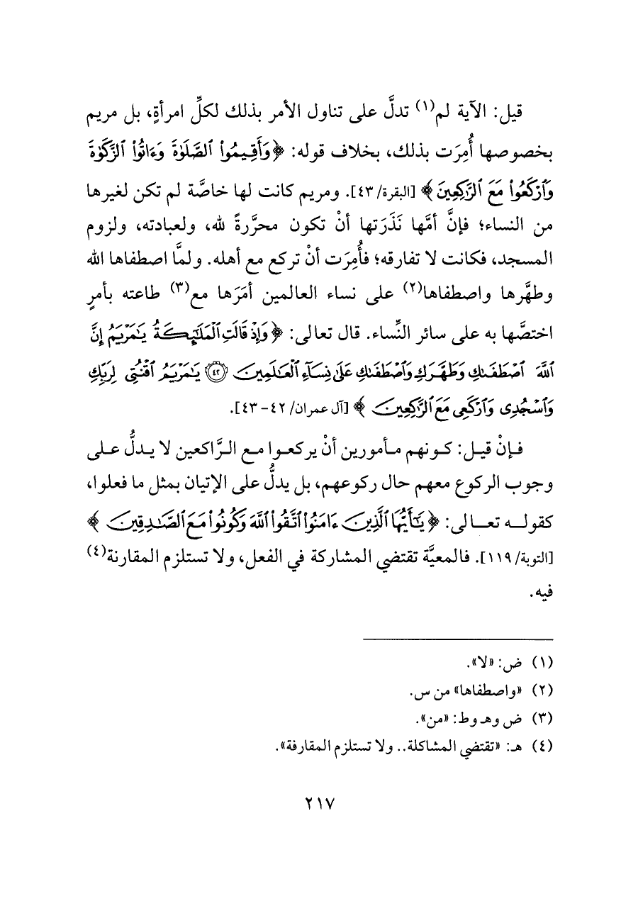 قيل: الآية لم (¬١) تدلَّ على تناول الأمر بذلك لكلِّ امرأةٍ، بل مريم بخصوصها أُمِرَت بذلك، بخلاف قوله: {وَأَقِيمُوا الصَّلَاةَ وَآتُوا الزَّكَاةَ وَارْكَعُوا مَعَ الرَّاكِعِينَ} [البقرة/٤٣]. ومريم كانت لها خاصَّة لم تكن لغيرها من النساء؛ فإنَّ أمَّها نَذَرَتها أنْ تكون محرَّرةً لله، ولعبادته، ولزوم المسجد، فكانت لا تفارقه؛ فأُمِرَت أنْ تركع مع أهله. ولمَّا اصطفاها الله وطهَّرها واصطفاها (¬٢) على نساء العالمين أمَرَها مع (¬٣) طاعته بأمرٍ اختصَّها به على سائر النِّساء. قال تعالى: {وَإِذْ قَالَتِ الْمَلَائِكَةُ يَامَرْيَمُ إِنَّ اللَّهَ اصْطَفَاكِ وَطَهَّرَكِ وَاصْطَفَاكِ عَلَى نِسَاءِ الْعَالَمِينَ (٤٢) يَامَرْيَمُ اقْنُتِي لِرَبِّكِ وَارْكَعِي مَعَ الرَّاكِعِينَ} [آل عمران/٤٢ - ٤٣].