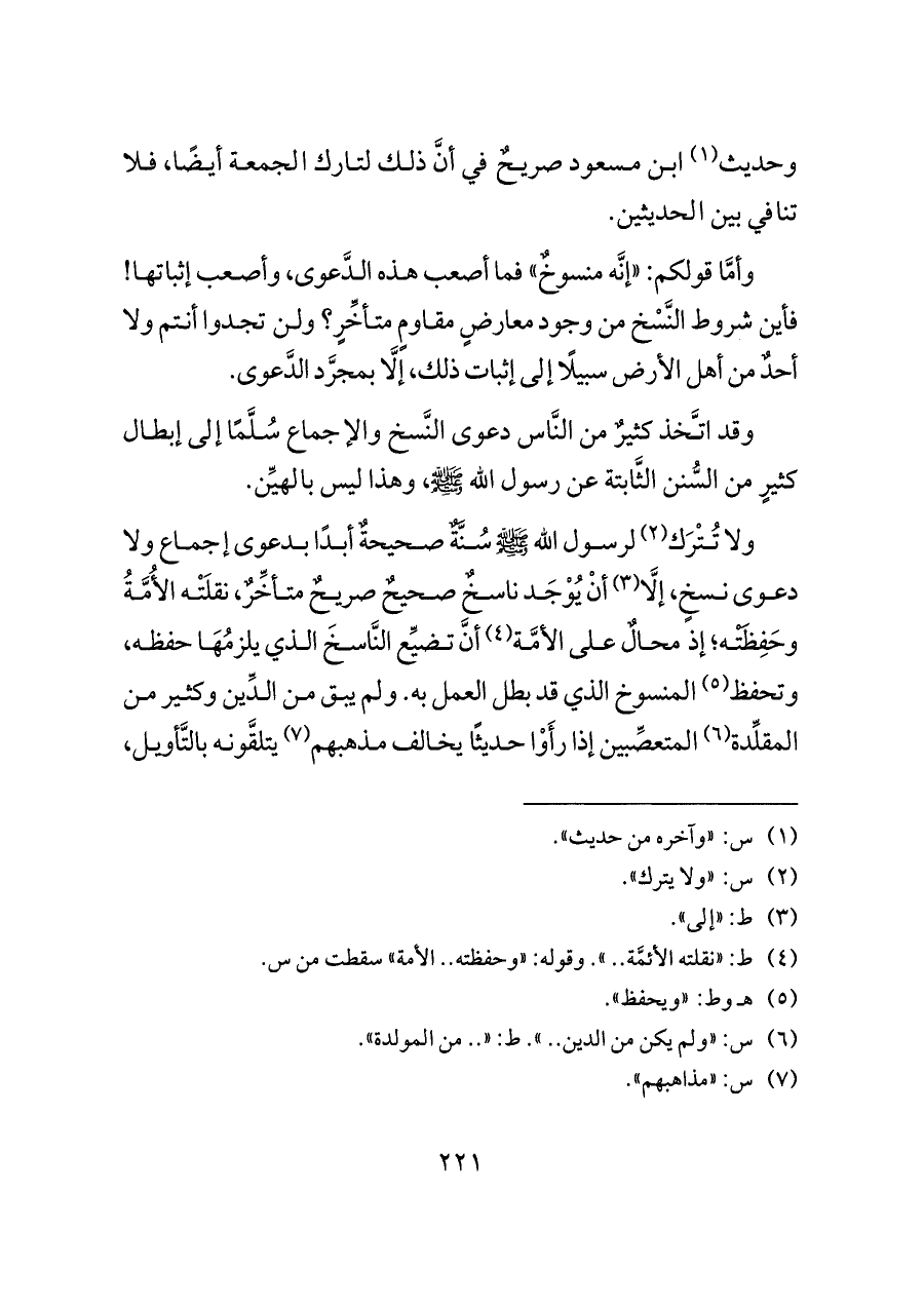 ولا تُتْرَك (¬٢) لرسول الله - صلى الله عليه وسلم - سُنَّةٌ صحيحةٌ أبدًا بدعوى إجماع ولا دعوى نسخٍ، إلَّا (¬٣) أنْ يُوْجَد ناسخٌ صحيحٌ صريحٌ متأخِّرٌ، نقلَتْه الأُمَّةُ وحَفِظَتْه؛ إذ محالٌ على الأمَّة (¬٤) أنَّ تضيِّع النَّاسخَ الذي يلزمُهَا حفظه، وتحفظ (¬٥) المنسوخ الذي قد بطل العمل به. ولم يبق من الدِّين وكثير من المقلِّدة (¬٦) المتعصِّبين إذا رأَوْا حديثًا يخالف مذهبهم (¬٧) يتلقَّونه بالتَّأويل،