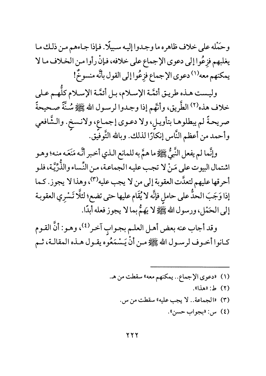 وإنَّما لم يفعل النَّبيُّ - صلى الله عليه وسلم - ما همَّ به للمانع الذي أخبر أنَّه مَنَعَه منه؛ وهو اشتمال البيوت على مَنْ لا تجب عليه الجماعة، من النِّساء والذُّرِّيَّة، فلو أحرقها عليهم لتعدَّت العقوبة إلى من لا يجب عليه (¬٣)، وهذا لا يجوز. كما إذا وَجَبَ الحدُّ على حاملٍ فإنَّه لا يُقَام عليها حتى تضع؛ لئلَّا تَسْرِي العقوبة إلى الحَمْل، ورسول الله - صلى الله عليه وسلم - لا يَهمُّ بما لا يجوز فعله أبدًا.