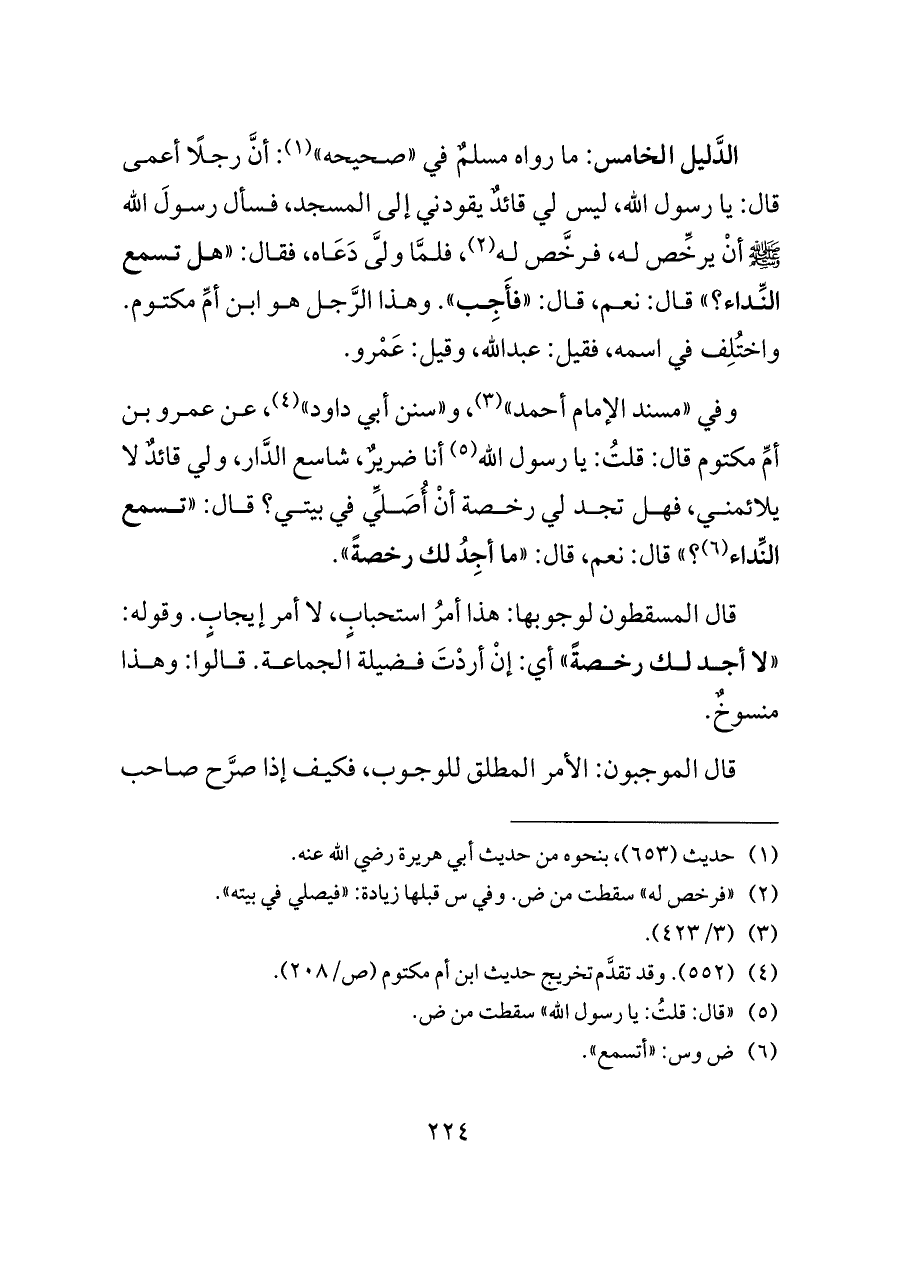 الدَّليل الخامس: ما رواه مسلمٌ في «صحيحه» (¬١): أنَّ رجلًا أعمى قال: يا رسول الله، ليس لي قائدٌ يقودني إلى المسجد، فسأل رسولَ الله - صلى الله عليه وسلم - أنْ يرخِّص له، فرخَّص له (¬٢)، فلمَّا ولَّى دَعَاه، فقال: «هل تسمع النِّداء؟» قال: نعم، قال: «فأَجِب». وهذا الرَّجل هو ابن أمِّ مكتوم. واختُلِف في اسمه، فقيل: عبدالله، وقيل: عَمْرو.