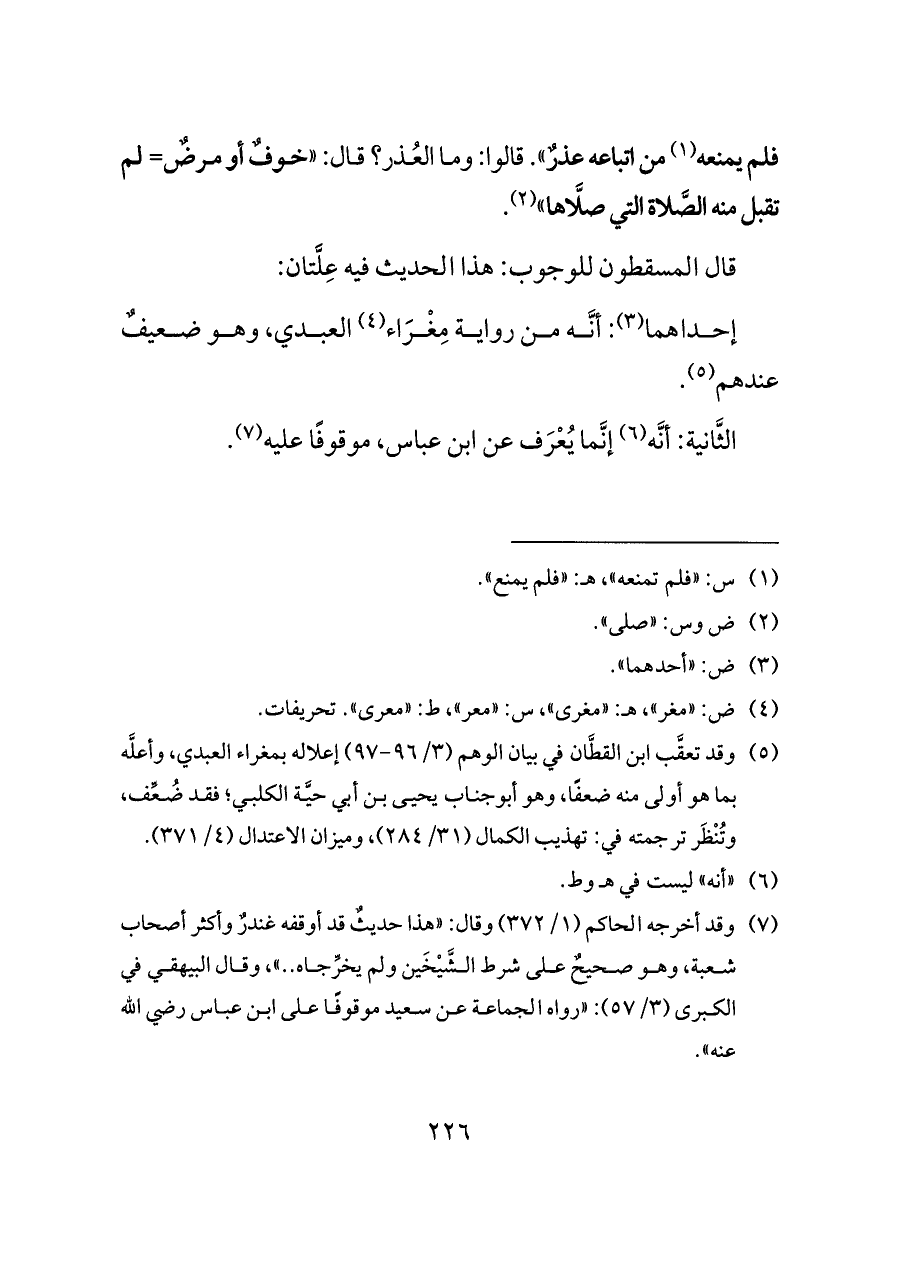 (¬٥) وقد تعقَّب ابن القطَّان في بيان الوهم (٣/ ٩٦ - ٩٧) إعلاله بمغراء العبدي، وأعلَّه بما هو أولى منه ضعفًا، وهو أبوجناب يحيى بن أبي حيَّة الكلبي؛ فقد ضُعِّف، وتُنْظَر ترجمته في: تهذيب الكمال (٣١/ ٢٨٤)، وميزان الاعتدال (٤/ ٣٧١).