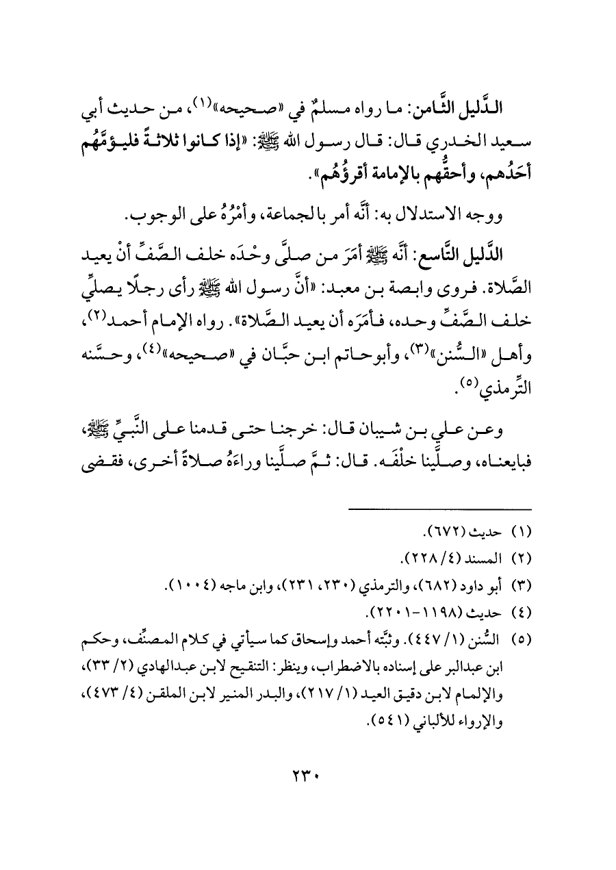 الدَّليل التَّاسع: أنَّه - صلى الله عليه وسلم - أمَرَ من صلَّى وحْدَه خلف الصَّفِّ أنْ يعيد الصَّلاة. فروى وابصة بن معبد: «أنَّ رسول الله - صلى الله عليه وسلم - رأى رجلًا يصلِّي خلف الصَّفِّ وحده، فأمَرَه أن يعيد الصَّلاة». رواه الإمام أحمد (¬٢)، وأهل «السُّنن» (¬٣)، وأبوحاتم ابن حبَّان في «صحيحه» (¬٤)، وحسَّنه التِّرمذي (¬٥).
