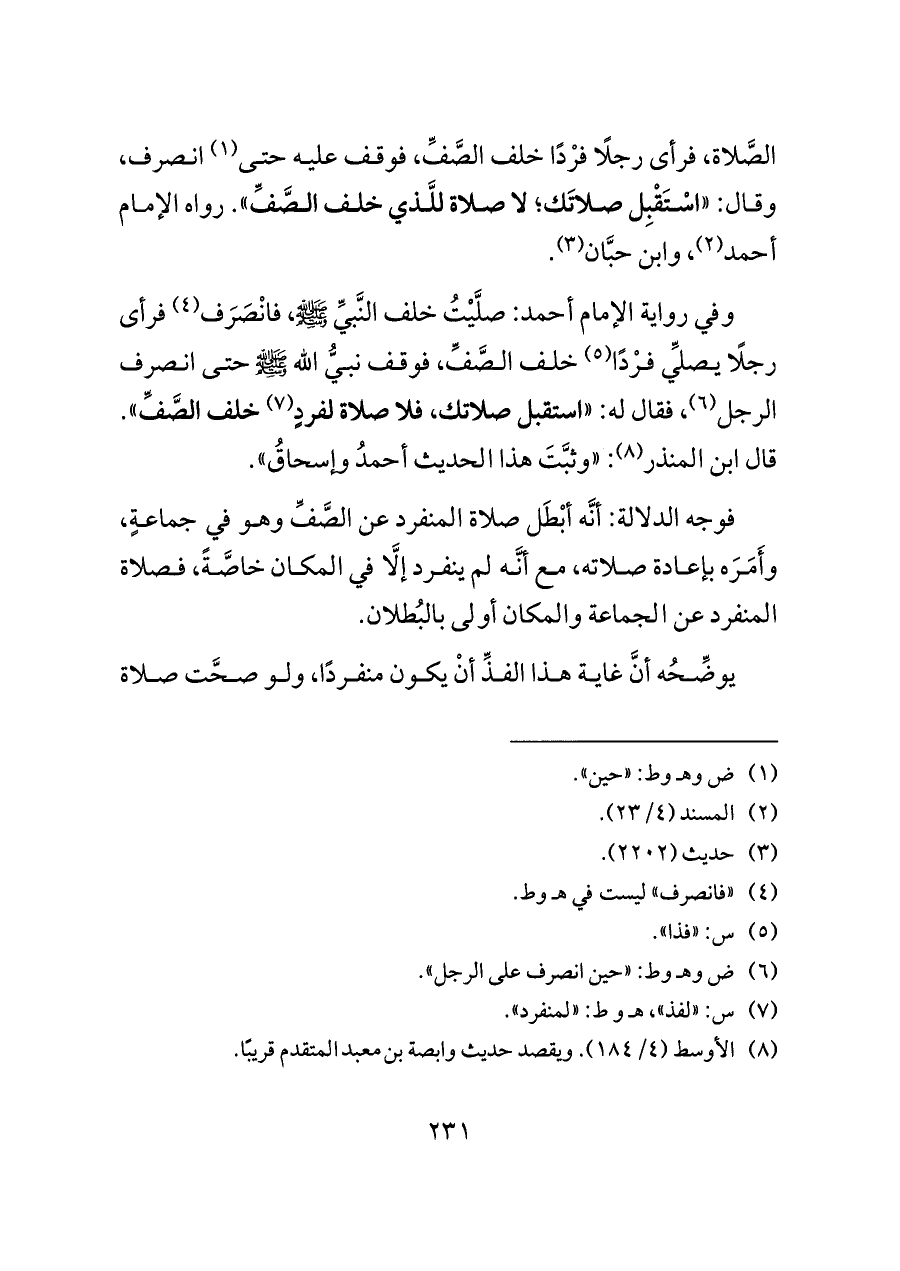 الصَّلاة، فرأى رجلًا فرْدًا خلف الصَّفِّ، فوقف عليه حتى (¬١) انصرف، وقال: «اسْتَقْبِل صلاتَك؛ لا صلاة للَّذي خلف الصَّفِّ». رواه الإمام أحمد (¬٢)، وابن حبَّان (¬٣).