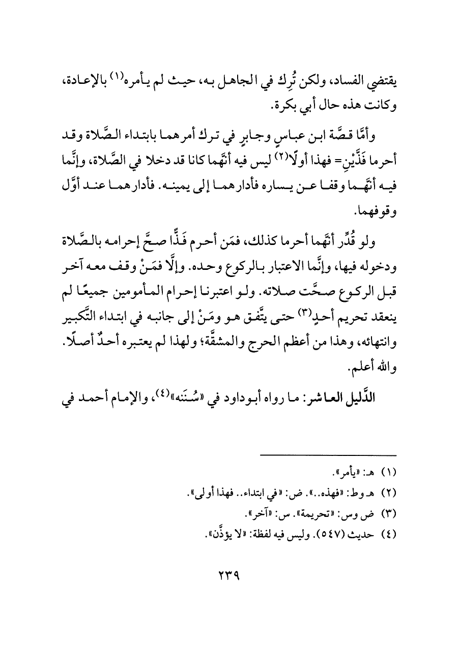 وأمَّا قصَّة ابن عباسٍ وجابرٍ في ترك أمرهما بابتداء الصَّلاة وقد أحرما فَذَّيْنِ= فهذا أولًا (¬٢) ليس فيه أنَّهما كانا قد دخلا في الصَّلاة، وإنَّما فيه أنَّهما وقفا عن يساره فأدارهما إلى يمينه. فأدارهما عند أوَّل وقوفهما.
