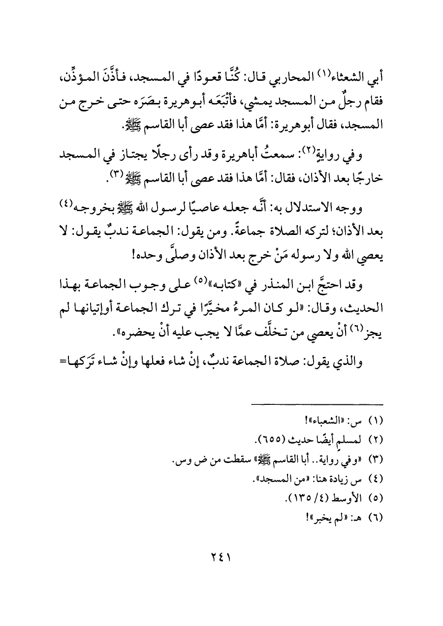 ووجه الاستدلال به: أنَّه جعله عاصيًا لرسول الله - صلى الله عليه وسلم - بخروجه (¬٤) بعد الأذان؛ لتركه الصلاة جماعةً. ومن يقول: الجماعة ندبٌ يقول: لا يعصي الله ولا رسوله مَنْ خرج بعد الأذان وصلَّى وحده!
