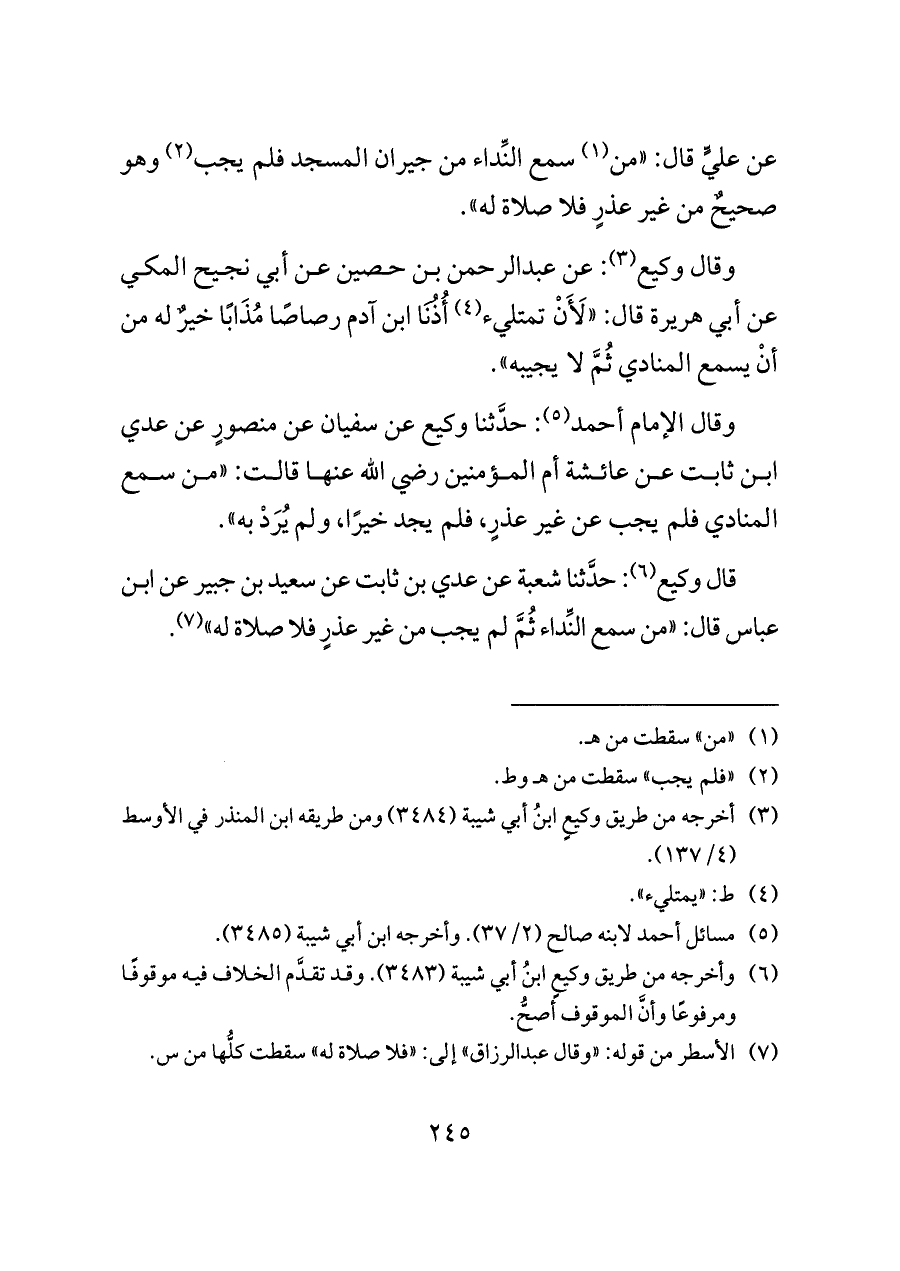 وقال وكيع (¬٣): عن عبدالرحمن بن حصين عن أبي نجيح المكي عن أبي هريرة قال: «لَأَنْ تمتليء (¬٤) أُذُنَا ابن آدم رصاصًا مُذَابًا خيرٌ له من أنْ يسمع المنادي ثُمَّ لا يجيبه».