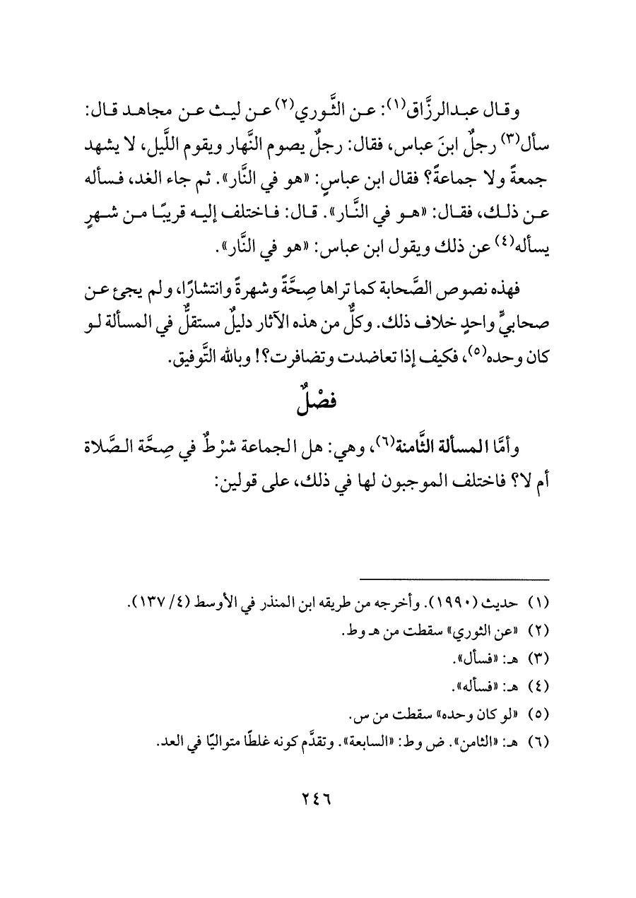 وقال عبدالرزَّاق (¬١): عن الثَّوري (¬٢) عن ليث عن مجاهد قال: سأل (¬٣) رجلٌ ابنَ عباس، فقال: رجلٌ يصوم النَّهار ويقوم اللَّيل، لا يشهد جمعةً ولا جماعةً؟ فقال ابن عباسٍ: «هو في النَّار». ثم جاء الغد، فسأله عن ذلك، فقال: «هو في النَّار». قال: فاختلف إليه قريبًا من شهرٍ يسأله (¬٤) عن ذلك ويقول ابن عباس: «هو في النَّار».